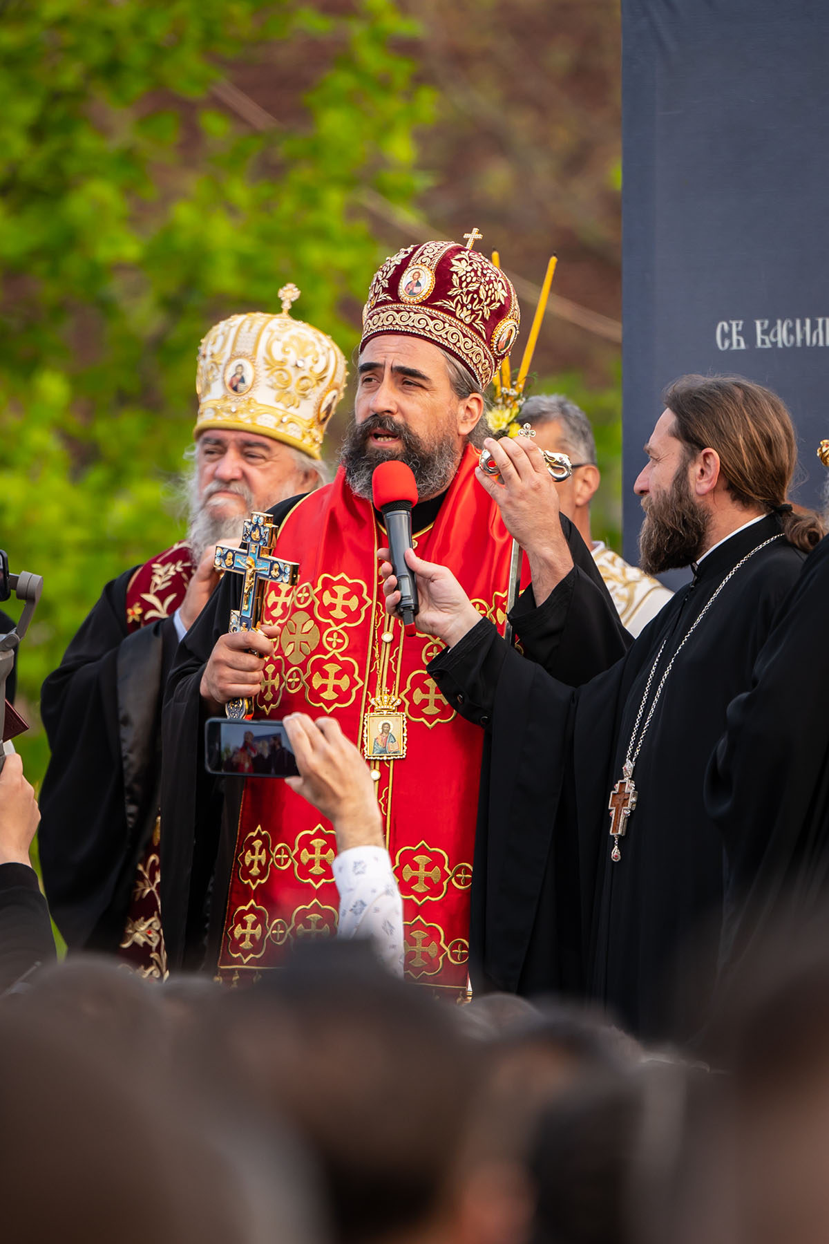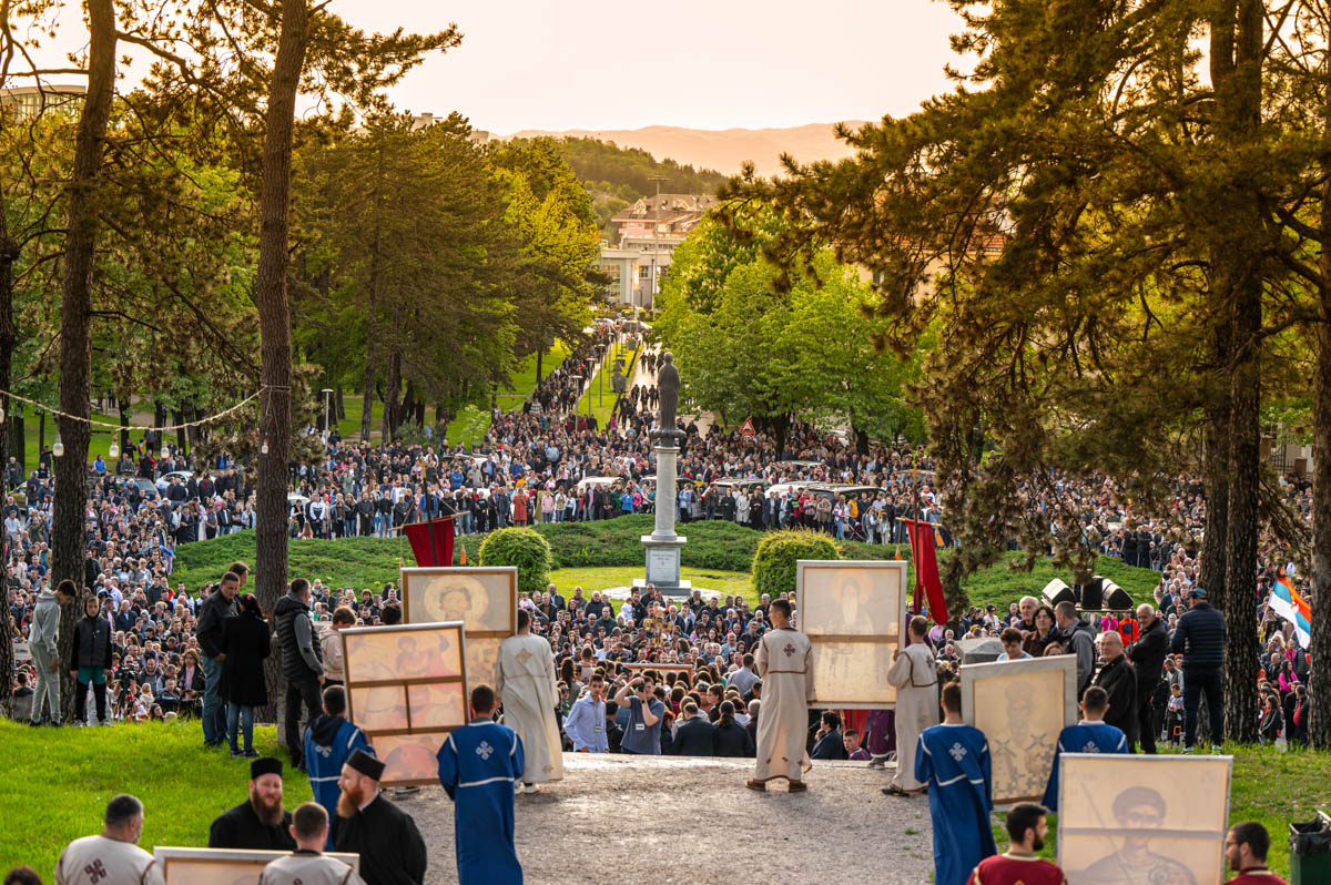 „Томе је свједочанство и ова величанствена литија у граду Никшићу, коју је Свети Василије освештао својим стопама за вријеме свог живота, и својим светим моштима походиће га неколико пута, али, заправо, он походи свој народ и пастирствује с неба и притиче не само овоме граду, него свуда у васионом свијету гдје га људи са вјером и побожношћу призивају. За њега ни видљивих, ни невидљивих граница, јер му је Господ дао ту силу и благодат и милост и истину да исцјељује и да помаже и да благосиља и да мири и да упућује на прави пут и да спашава од невоља, а посебно да исцјељује од душевних и тјелесних немоћи“.