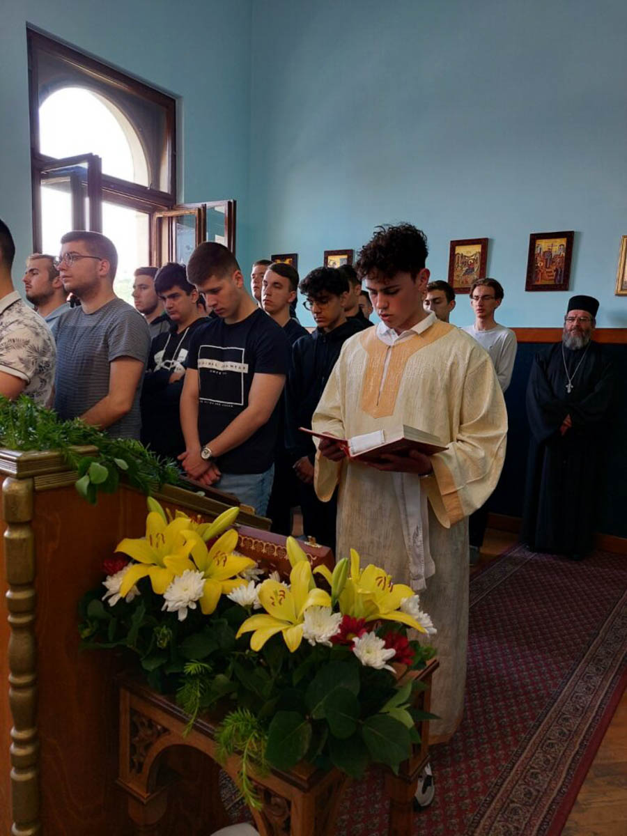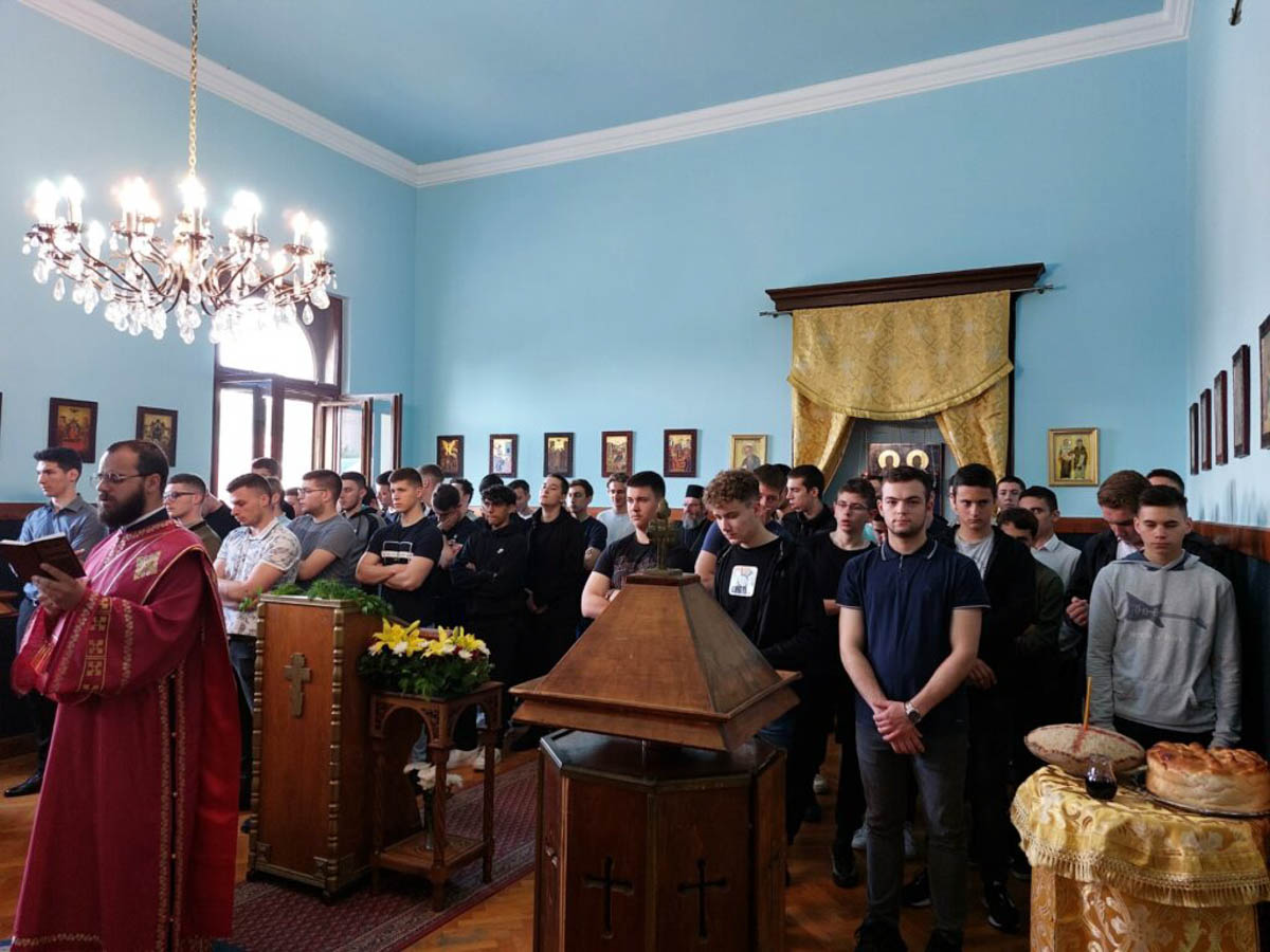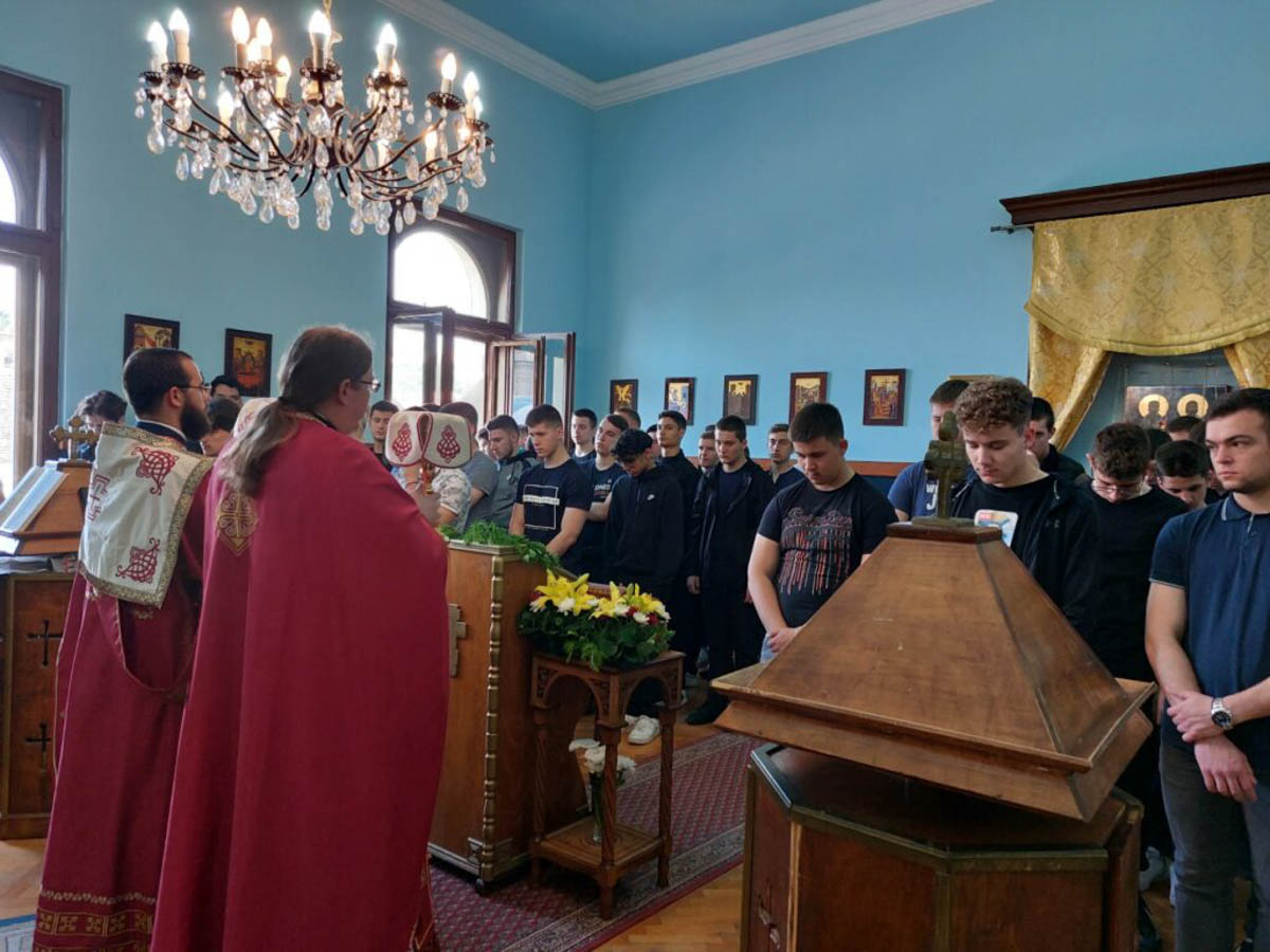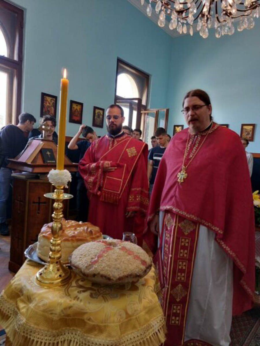 Свету Литургију је у јутарњим сатима служио ректор богословије са ђаконом Марком Стефановићем, благосиљано је жито и славски колач.