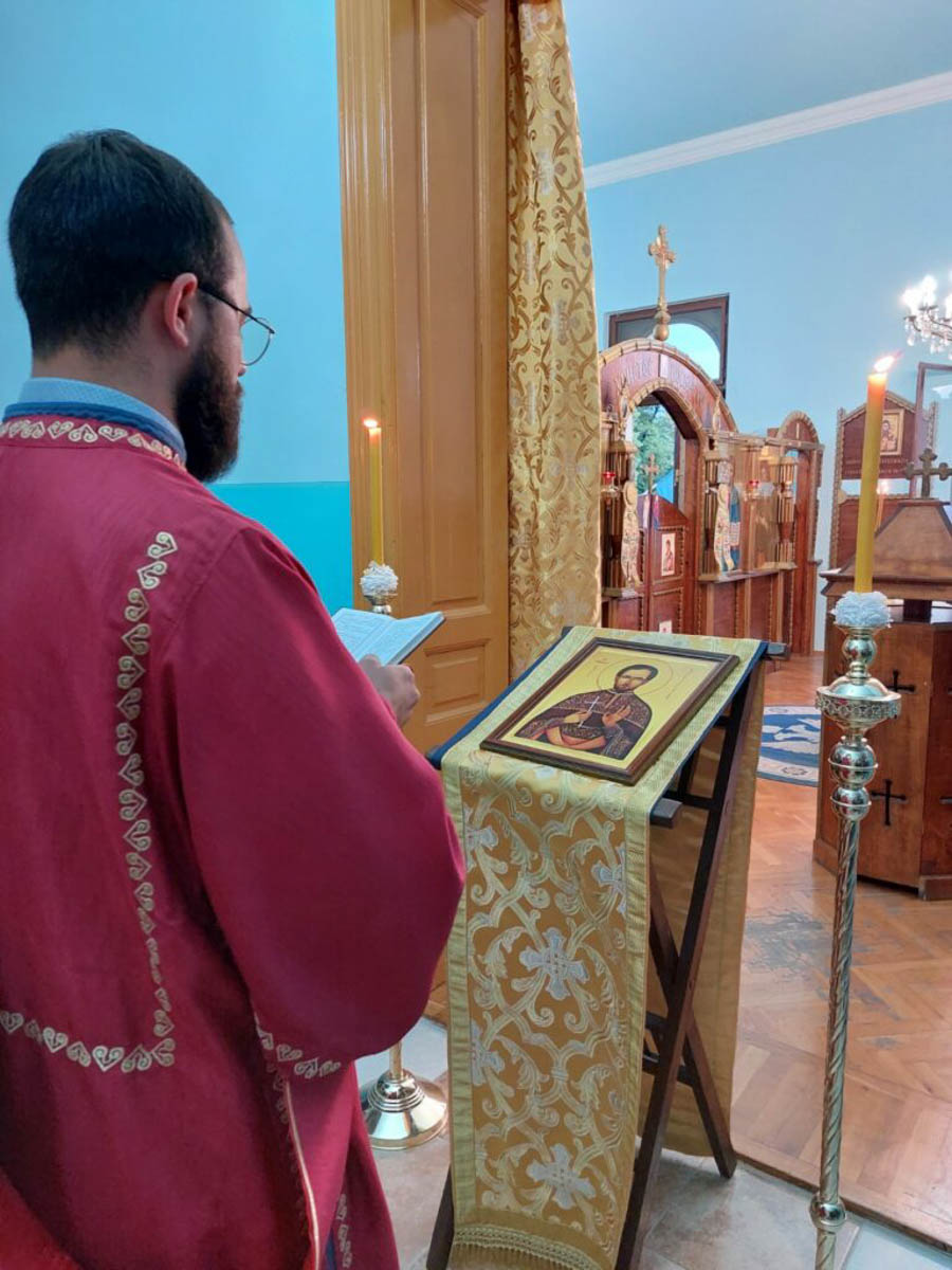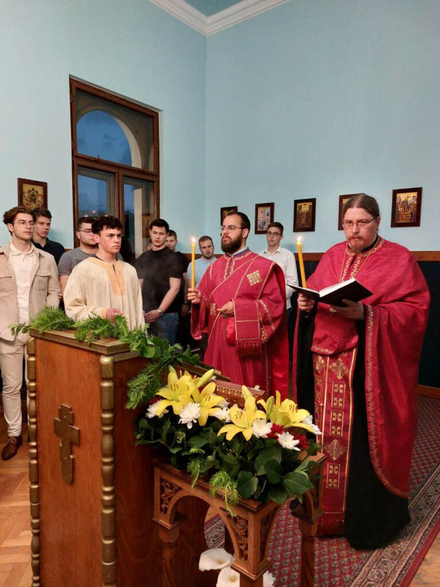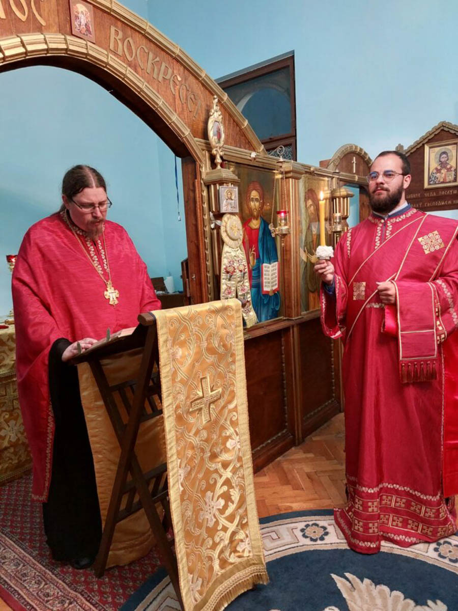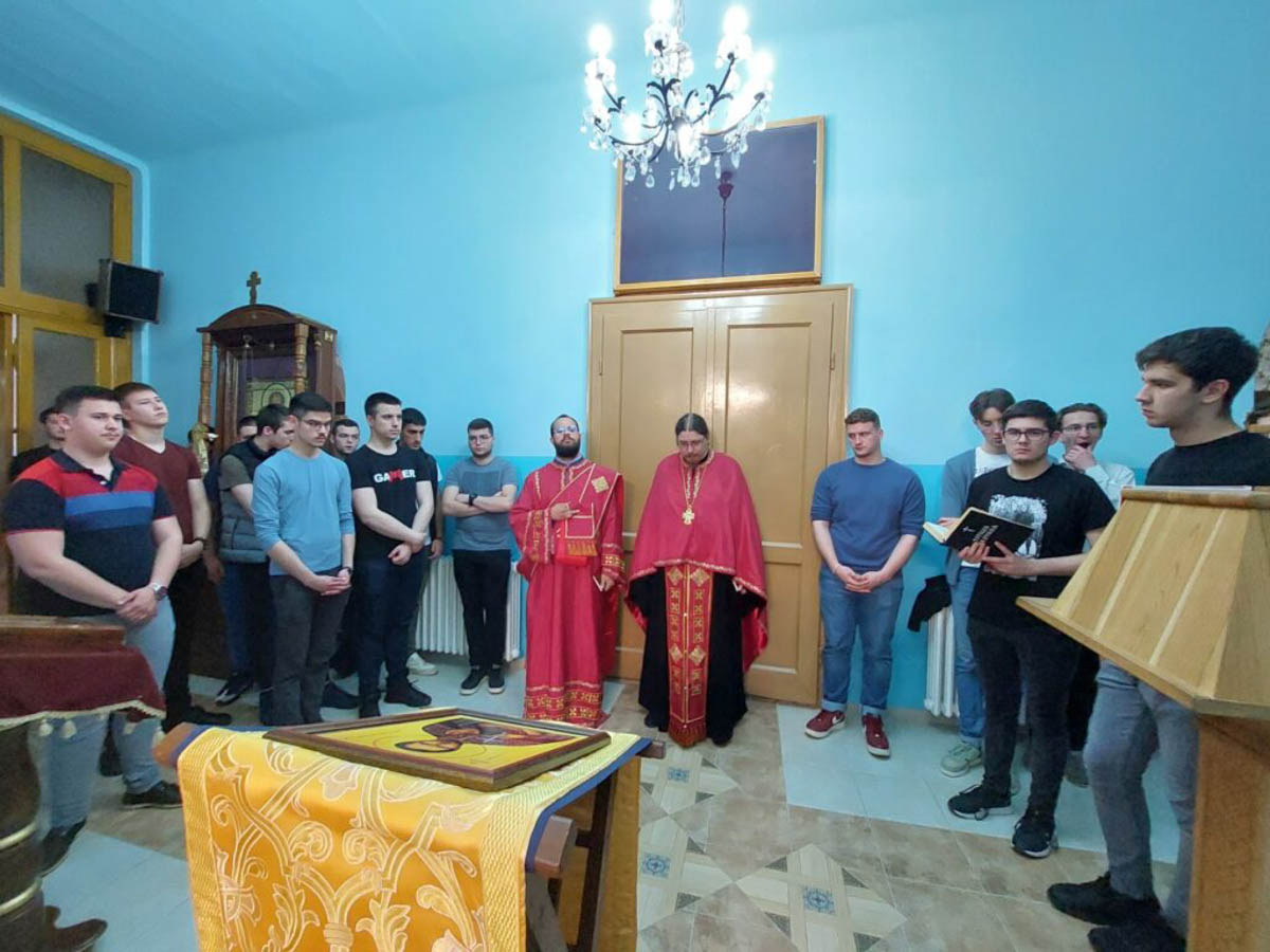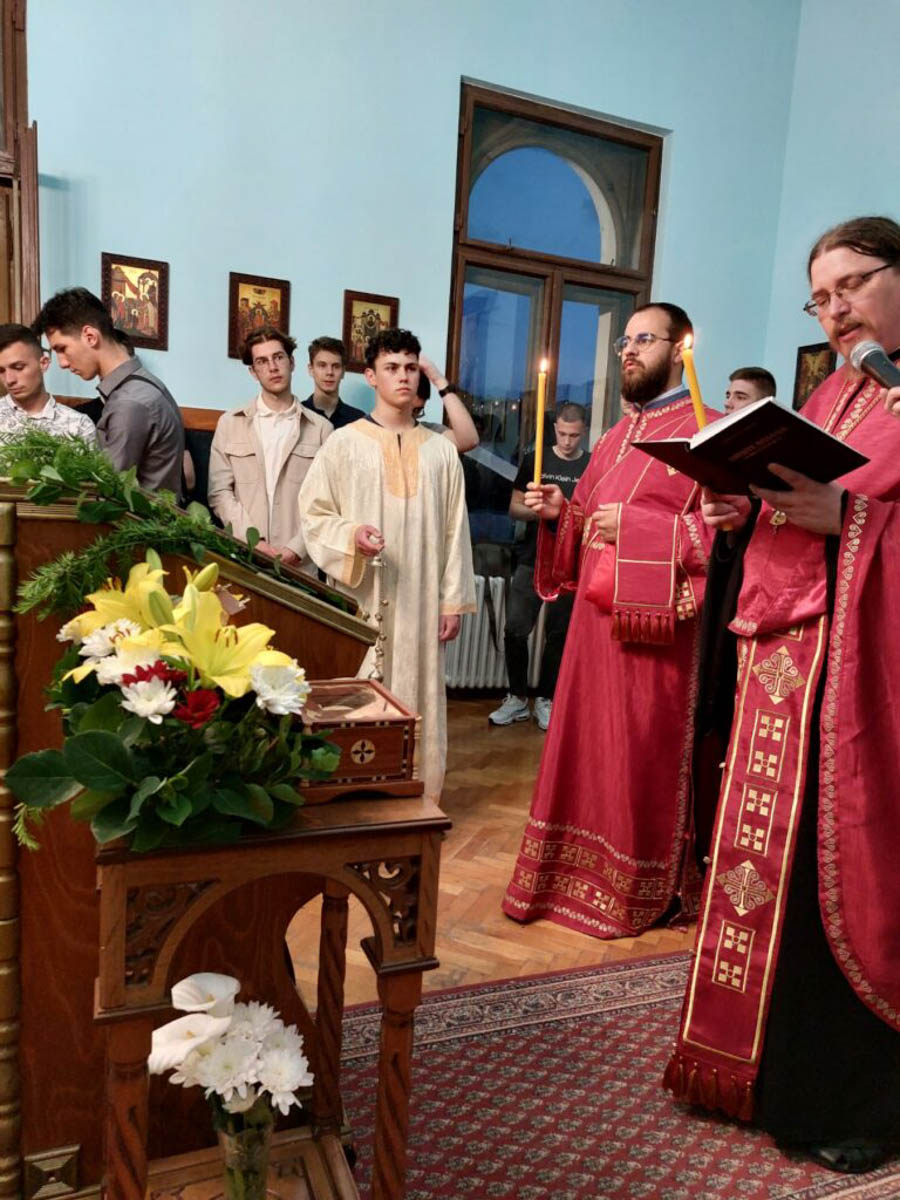 Свету Литургију је у јутарњим сатима служио ректор богословије са ђаконом Марком Стефановићем, благосиљано је жито и славски колач.