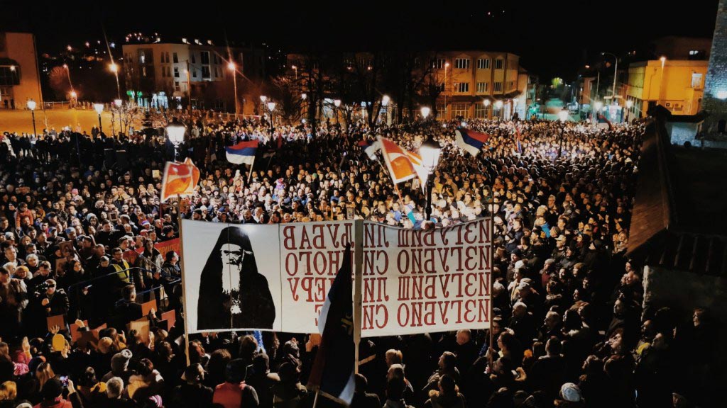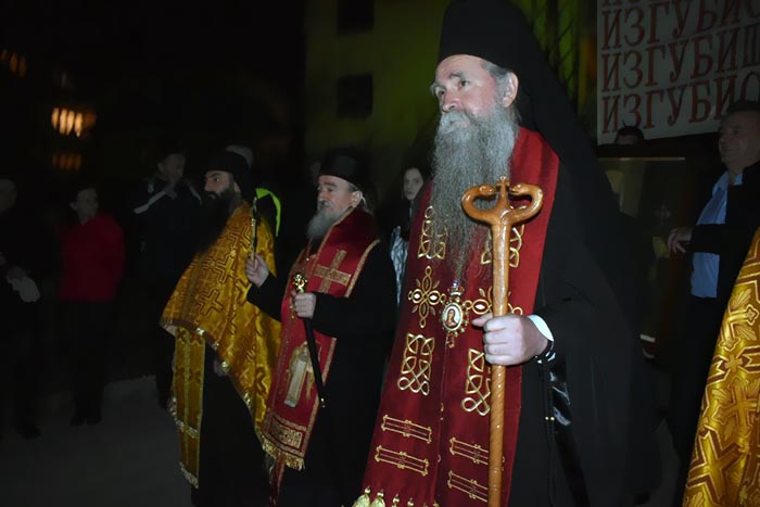 На тргу испред хотела зауставили су се и сви у један глас изговорили молитву Оче наш. Затим се на позив Епископа Атанасија сабранима обратио Епископ Јоаникије који је литију назвао народном скупштином: – Откуда оволика радост када смо изложени истовремно и великој неправди и дискриминацији? Зато што смо заједно изашли да се боримо против неправде, од старца до детета, сви заједно као једно биће. А знамо, где су деца и где је верни народ Божији, ту су и Анђели Божији и Свеци Божији. Будите уверени да је на вашем челу Свети Сава. Ви сте осетили да се ових дана, када се боримо против неправде и боримо за слободу вере, пише историја. И ви сте сви учесници тих важних догађаја. И борба за правду даје радост и смисао живота, а нарочито кад се боримо за слободу своје вере и својих светиња.
