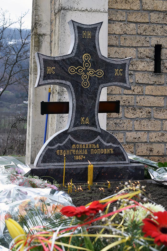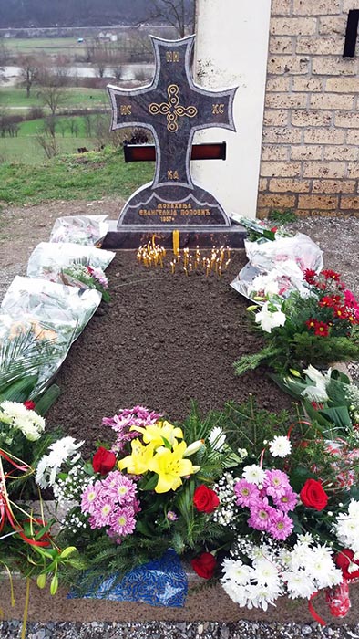 Мати Евангелија је сахрањена у порти манастира Вољавац.