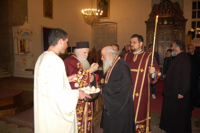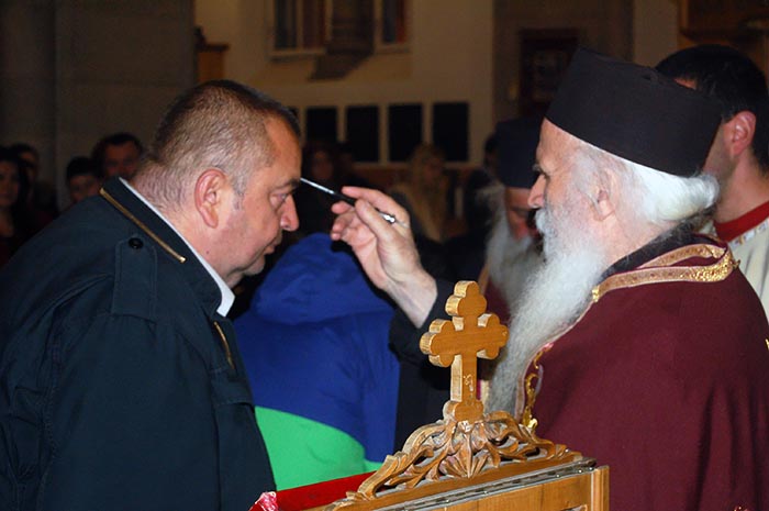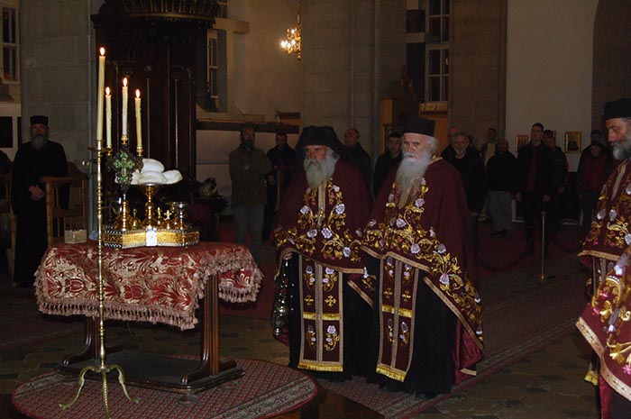 Током бденија изнијет је Часни и Животворни Крст на поклоњење вјерницима у Саборном храму Светог Василија Острошког у Никшићу.