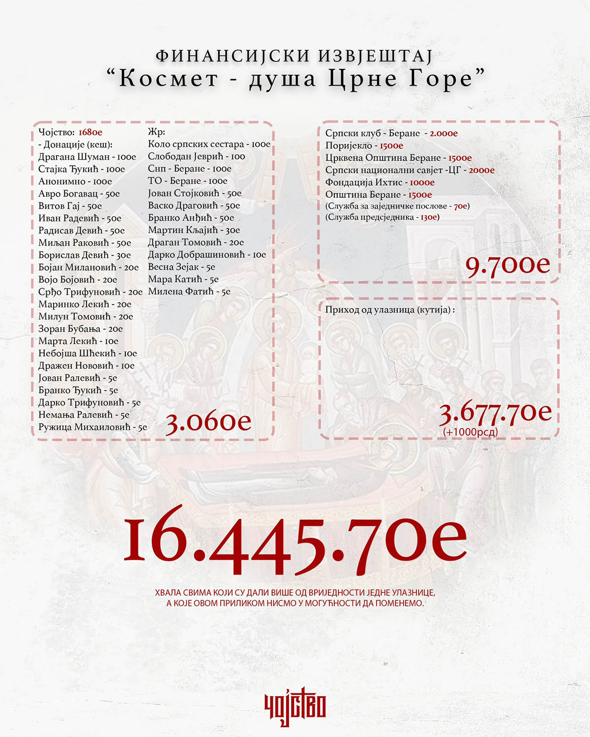 Представљамо вам детаљан финансијски извјештај са добротворне вечери за осликавање Цркве Успења Пресвете Богородице у Ораховцу. Свима се захваљујемо на огромном одзиву и још једној успјешној акцији коју смо овога пута реализовали у сарадњи са Општином Беране, Црквеном Општином Беране, Српским националним савјетом, Српским клубом, Организацијом "Поријекло" из САД-а и Фондацијом "Ихтис". Сви заједно, уједињени, за нашу браћу и сестре из Ораховца!