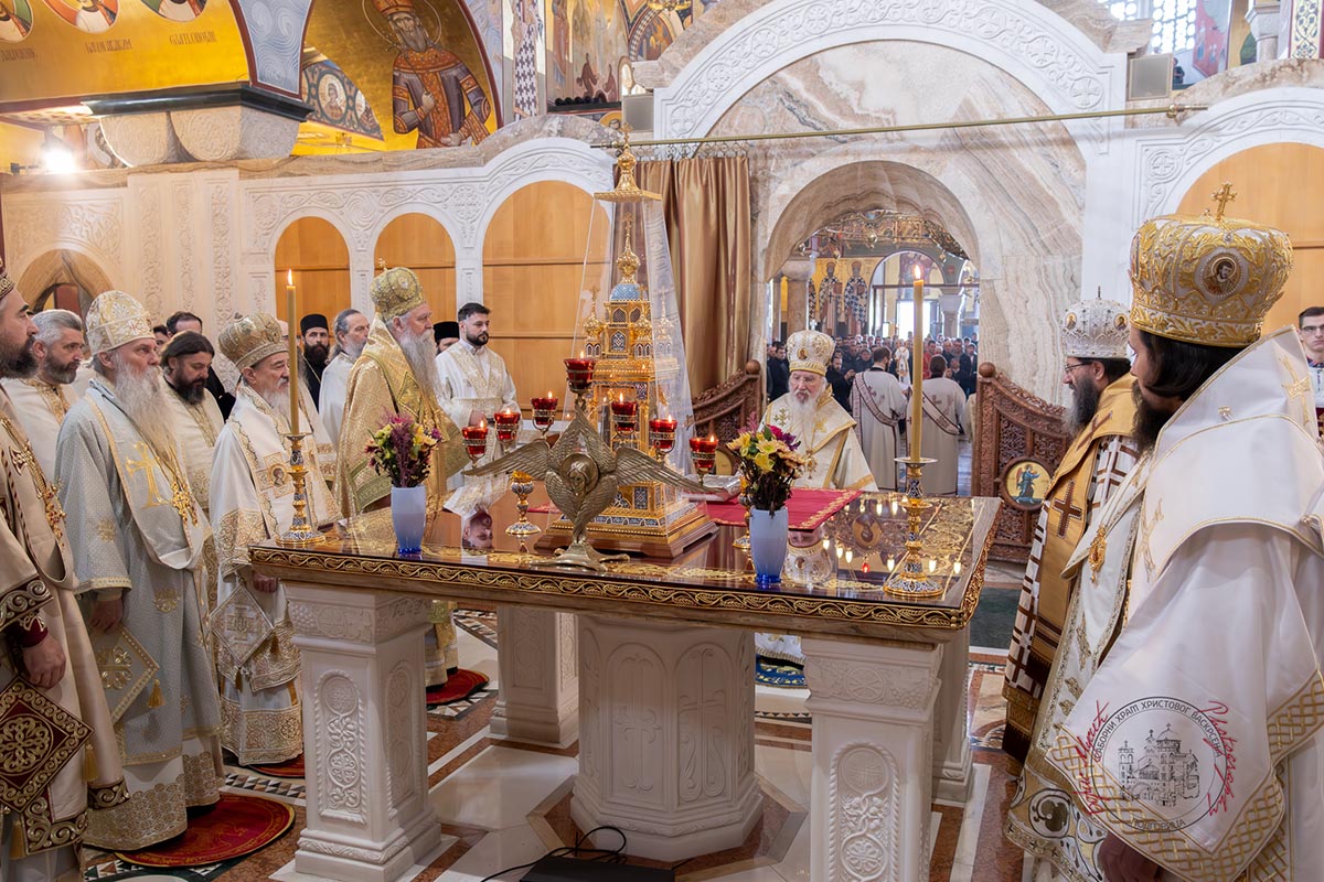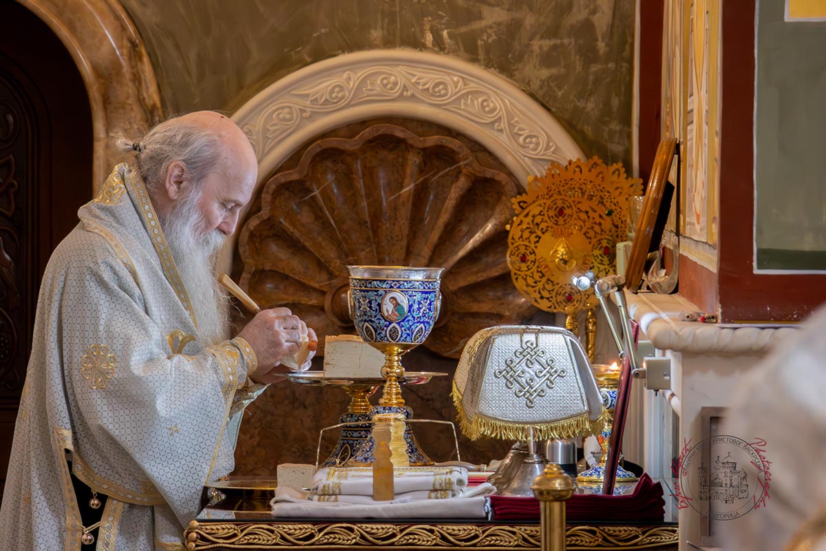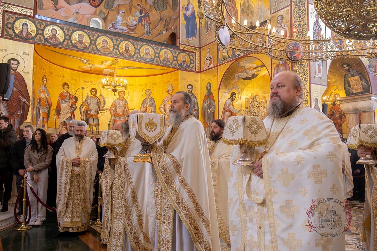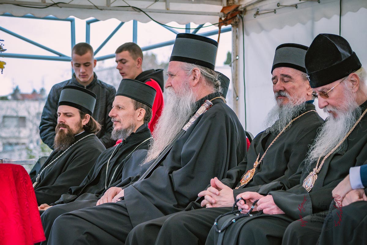 Светом архијерејском литургијом у Саборном храму началствовао је Његово високопреосвештенство Митрополит берлински и њемачки Руске заграничне цркве г. Марко, уз саслужење високопреосвећене господе: Архиепископа цетињског Митрополита црногорско–приморског Јоаникија, Архиепископа и Митрополита жичког Јустина, Архиепископа и Митрополита милешевског Атанасија, Архиепископа мостарско-требињског и Митрополита захумско-херцеговачког и стонско-приморског Димитрија, преосвећене господе епископа: пакрачко-славонског Јована, буеносајреског и јужно-централноамеричког, администратора Митрополије загребачко-љубљанске, Кирила, будимљанско-никшићког Методија и диоклијског Пајсија, многобројног свештенства и свешеномонаштва, у молитвеном присуству вјерног народа.