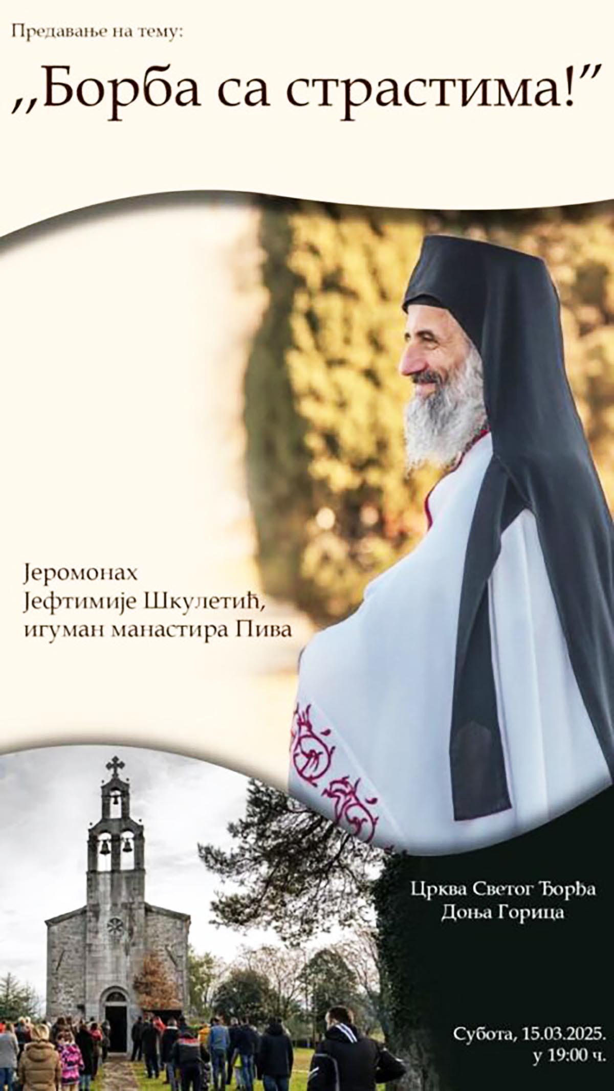 Јеромонах Јефтимије (Шкулетић) – игуман Манастира Пива одржаће, у суботу – 15.3. у Цркви Светог Ђорђа у Доњој Горици, предавање на тему: Борба са страстима.