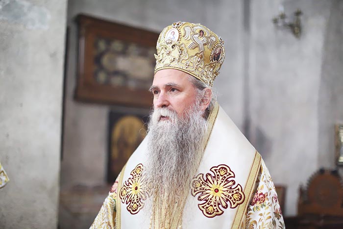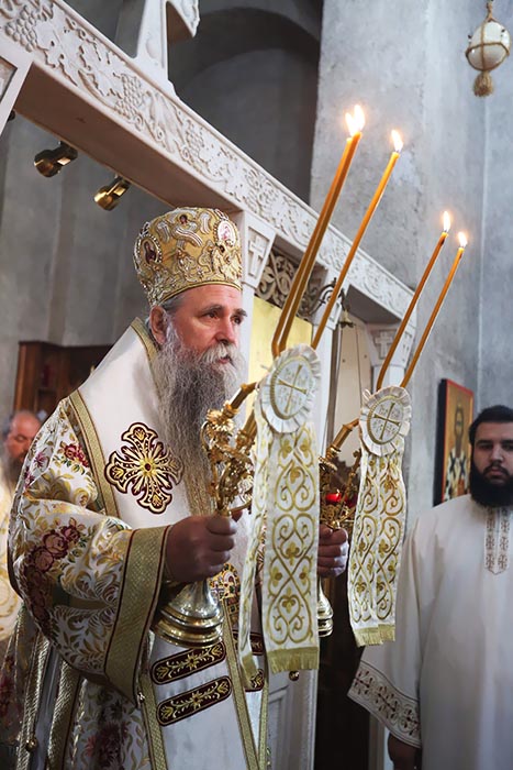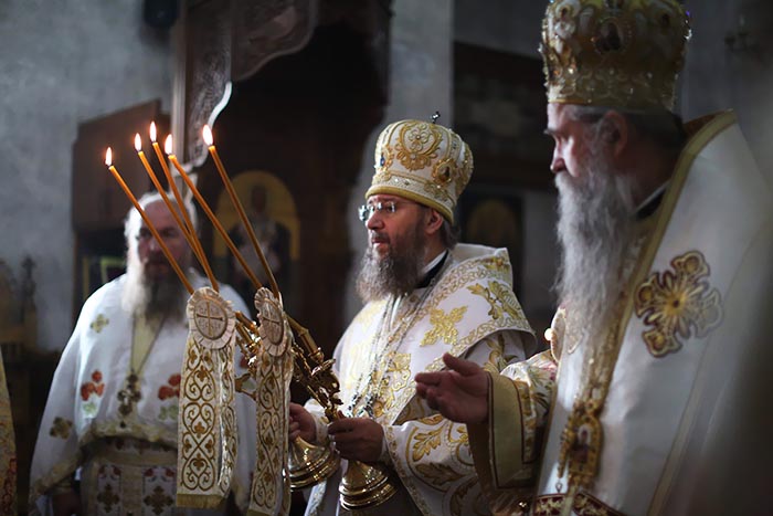 Захвалио је Високопреосвећеном Митрополиту Антонију што је, у оквиру посјете Митрополији црногорско-приморској и Високопреосвећеном Митрополиту Амфилохију, благоизволио да посјети Епархију будимљанско-никшићу, а нарочито што су заједно узнијели молитве Господу. У спомен одслужене службе, на данашњи велики празник, Преосвећени Епископ је Митрополиту Антонију уручио на дар, који је установљен поводом осам вјекова Епископије, панагију са ликом иконе из Епархије будимљанско-никшићке.
