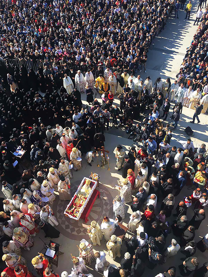 Свету заупокојену архијерејску службу са опелом служио је у овом храму Његова Светост Патријарх српски г. Иринеј, уз саслужење господе Митрополита: бориспољског и броварског Антонија (Украјинска православна црква), елбасанског Андона (Албанска православна црква) и загребачко-љубљанског Порфирија и господе Епископа: будимљанско-никшићког и администратора Митрополије црногорско-приморске Јоаникија, бачког Иринеја, шумадијског Јована, милешевског Атанасија, дизелдорфског и њемачког Григорија, полошко-кумановског Јоакима, рашко-призренског Теодосија, крушевачког Давида, Епископ пакрачко-славонског Јована, бихаћко-петровачког Сергија, Епископ тимочког Илариона, нишког Арсенија, захумско-херцеговачког Димитрија, ремезијанског Стефана, диоклијског Методија и умировљеног захумско-херцеговачког Атанасија, многобројног свештенства и свештеномонаштва наше и других помјесних Цркава и молитвено учешће хиљада вјерника.