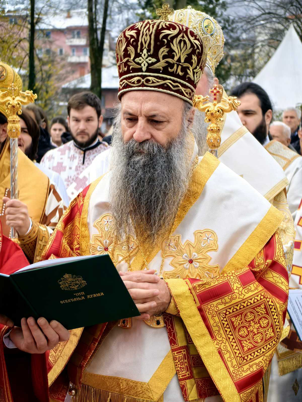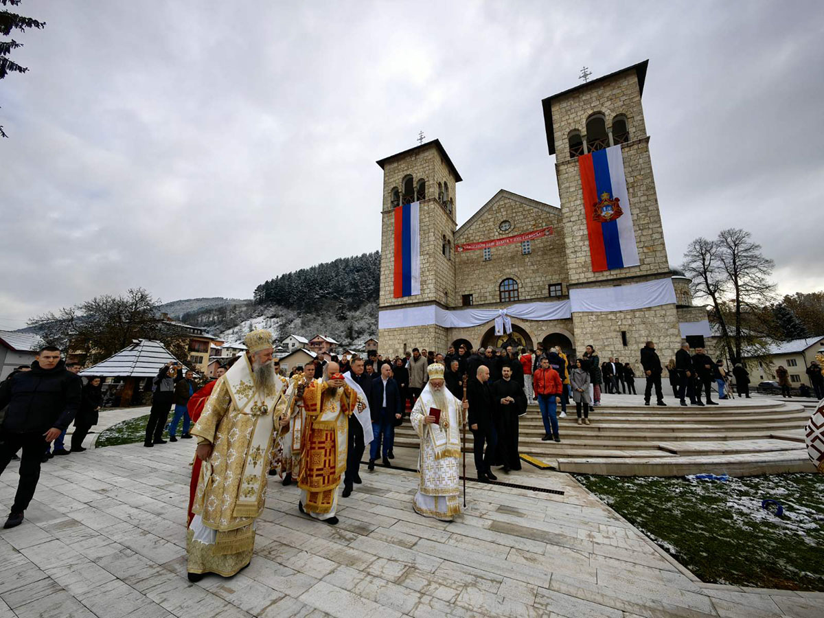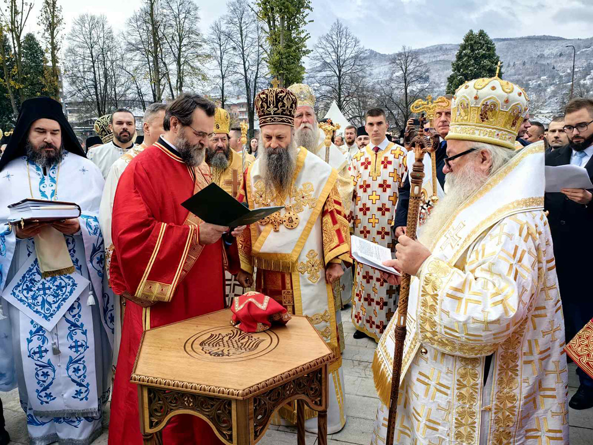Торжествено литургијско сабрање започело је свечаним чином великог освећења Светосавског храма у Фочи којим је началствовао Његова Светост Патријарх г. Порфирије уз саслужење високопреосвећене и пресвећене господе архијереја: дабробосанског Хризостома, црногорско-приморског Јоаникија, жичког Јустина, диселдорфскоги немачког Григорија, славонског Јована, бихаћко-петровачког Сергија, захумско-херцеговачког и приморског Димитрија, будимљанско-никшићког Методија, шабачког Јеротеја и јегарског Нектарија.