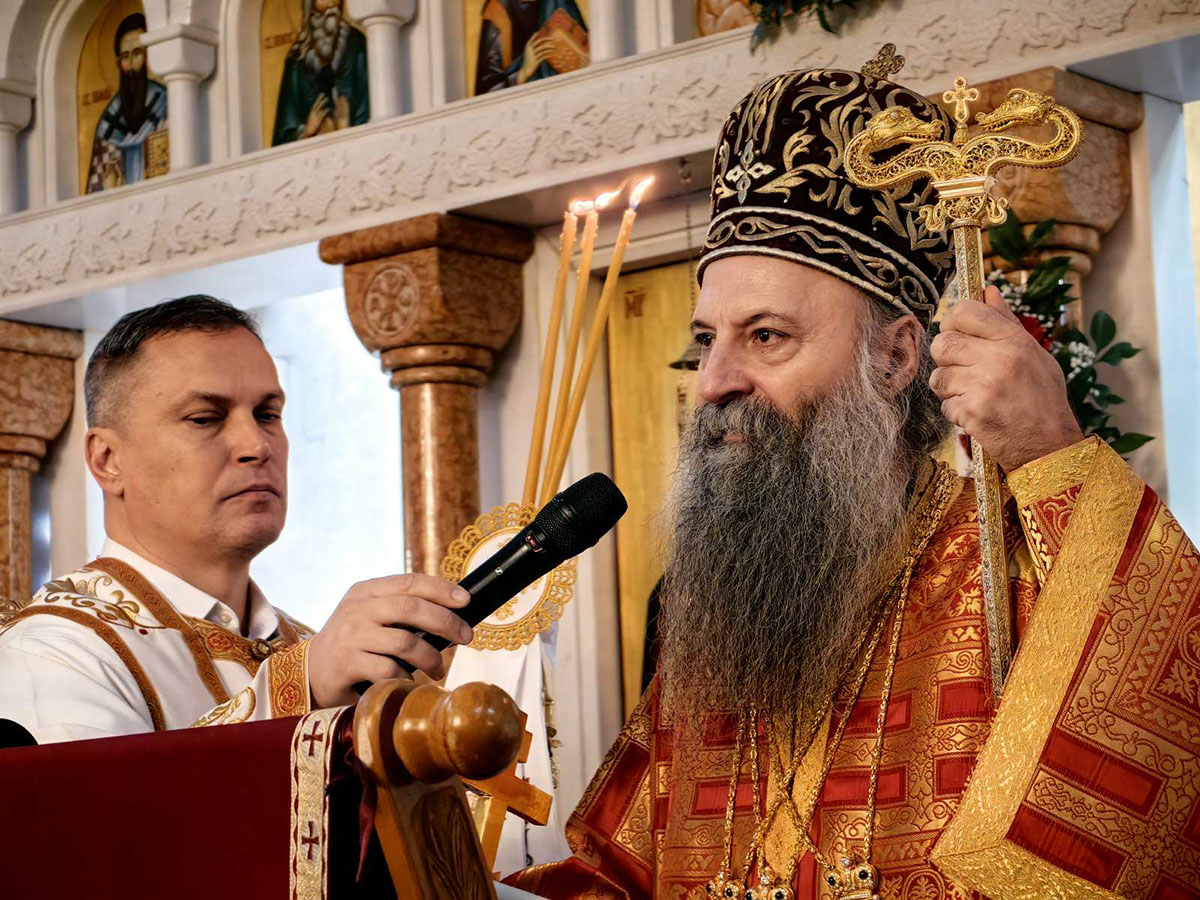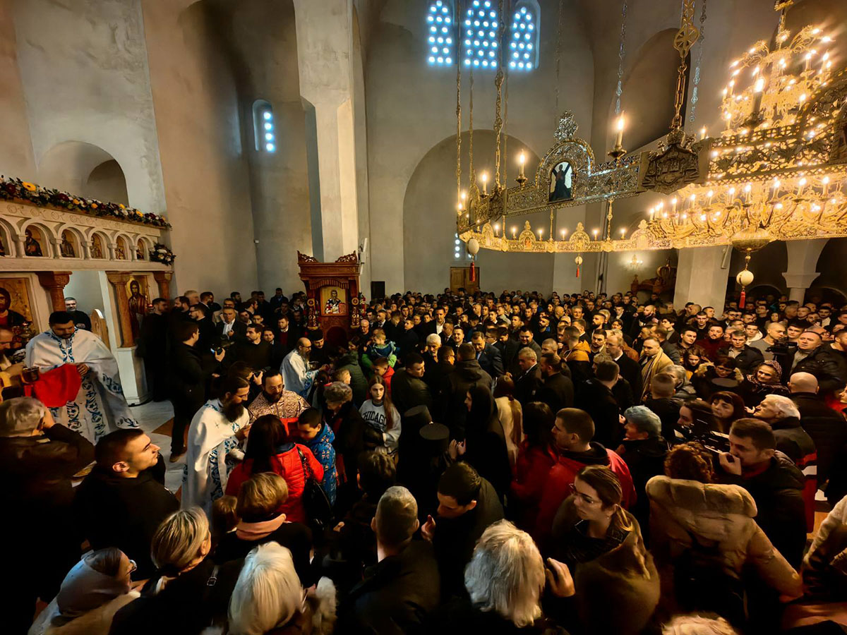 Његова Светост Патријарх српски г. Порфирије началствовао је 26. новембра 2023. године, на празник Светог Јована Златоустог, светом архијерејском Литургијом у цркви Светог Саве у Фочи.