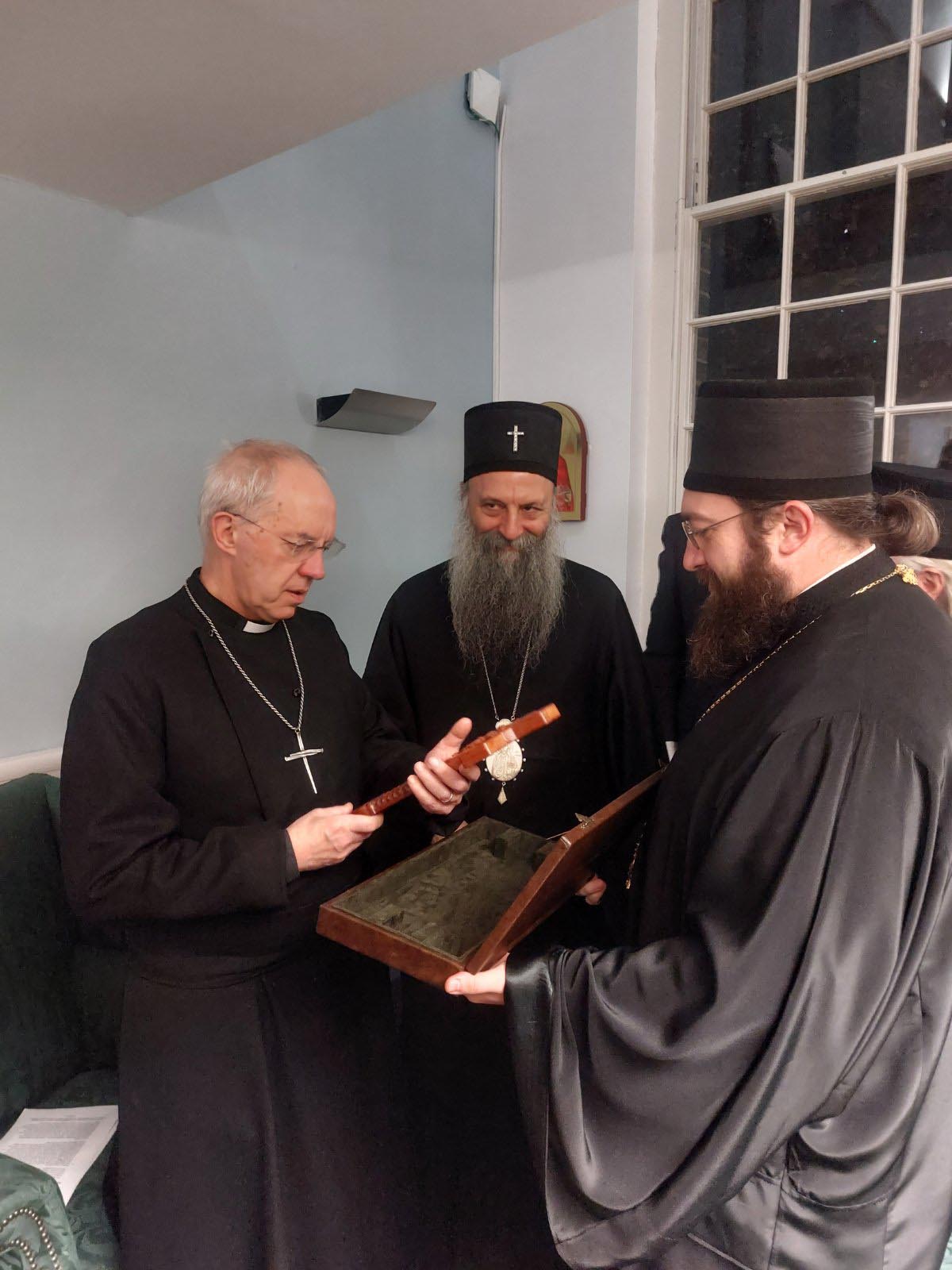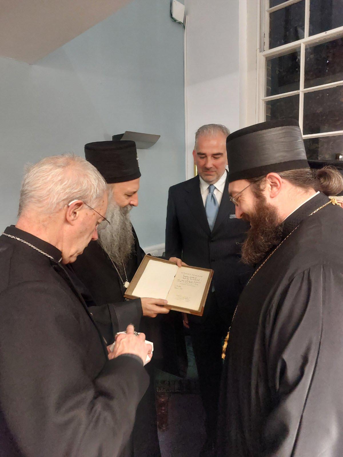 Сусрет првојерарха Српске Православне Цркве и Цркве Енглеске је протекао у срдачној атмосфери. Том приликом Архиепископ кентерберијски је уручио Патријарху српском оригинални примерак књиге Светог владике Николаја Велимировића из 1915. године са његовим личним потписом и посветом која говори о страдању српског народа у време Великог рата. Посебно је наглашена веза измеђа Српске Православне Цркве и Цркве Енглеске у том драматичном периоду, као и добри односи између два светска рата. Патријарх је домаћину као уздарје поклонио ручно изрезбарени дрвени крст.
