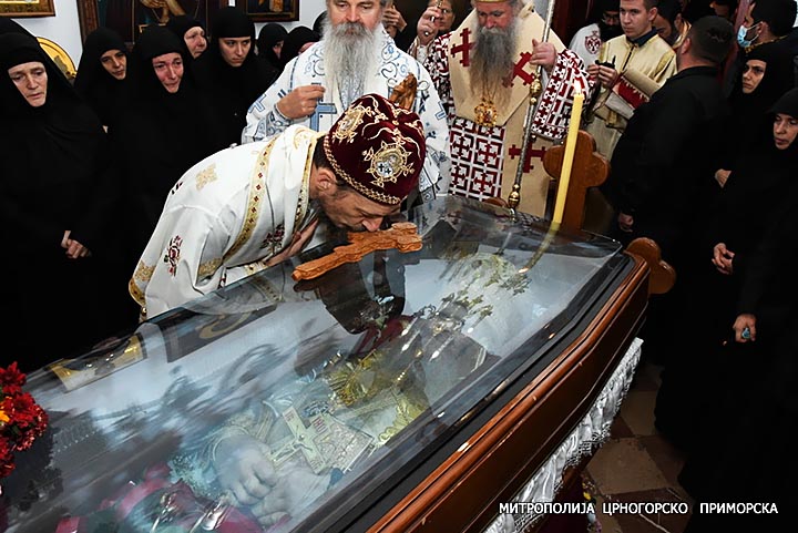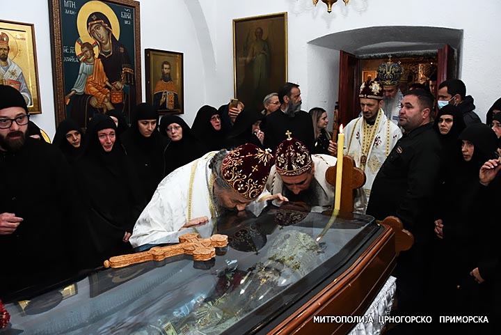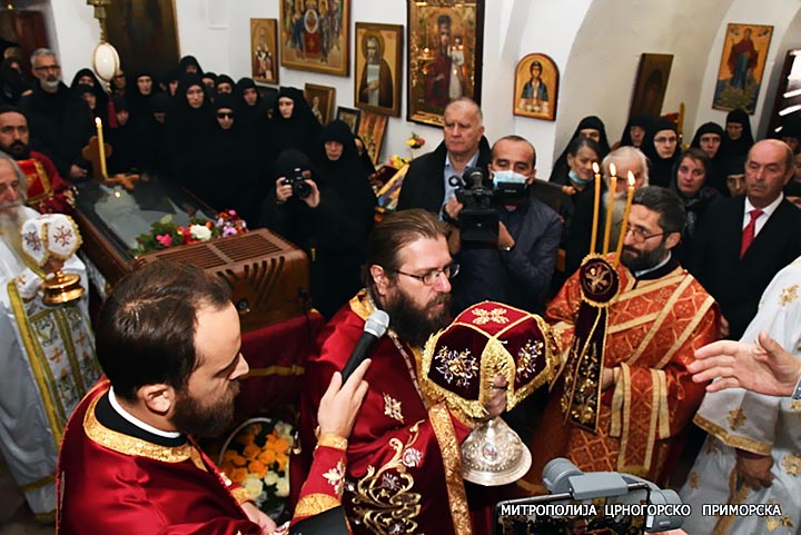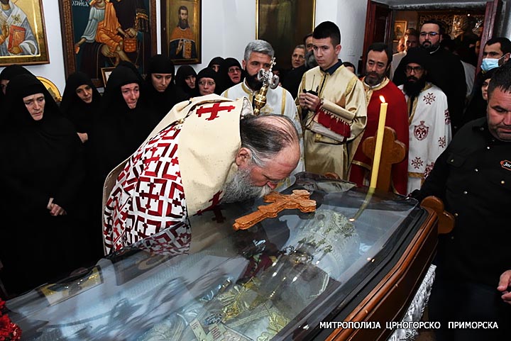 Обраћајући се великом броју сабраних који су се у молитвеној тишини поклањали одру Митрополита Амфилохија, Владика Теодосије је казао да на данашњи празник у овој свештеној обитељи, поред одра нашега оца и брата саслужитеља, учитеља Светога нашег Митрополита и архиепископа Амфилохија, можемо да заблагодаримо Богу и кажемо “слава Богу за све, слава Богу на Његовом промислу, слава Богу на његовом дару да смо у нашем времену имали оваквог јерарха, пастира, учитеља и оца који нас је учио не само ријечју, него животом и примјером”.