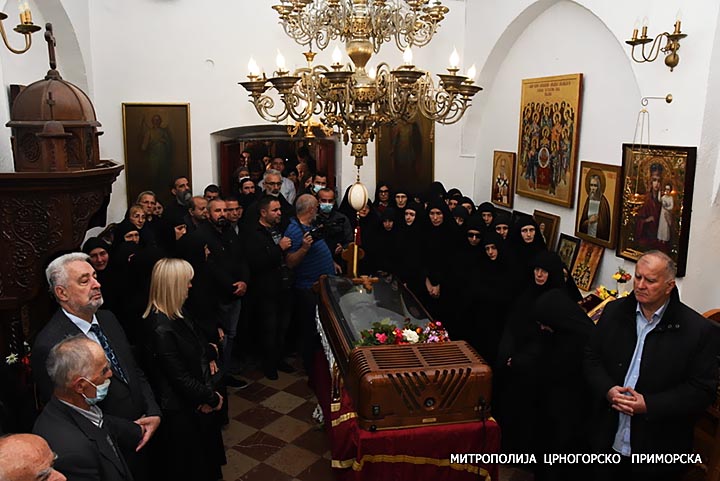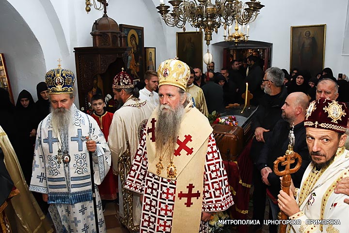 Сабрани данас овдје сви у овој свештеној обитељи на данашњи празник Светог апостола и јеванђелиста Луке и Светих Петра Првог и Другог Цетињског, поред одра нашега оца и брата саслужитеља, учитеља Светога нашег Митрополита и Архиепископа Амфилохија, можемо да заблагодаримо Богу, да кажемо слава Богу за све, слава Богу на његовом промислу. Слава Богу на његовом дару да смо у нашем времену имали оваквог јерарха, пастира, учитеља и оца који нас је учио не само речју, него животом и примјером.