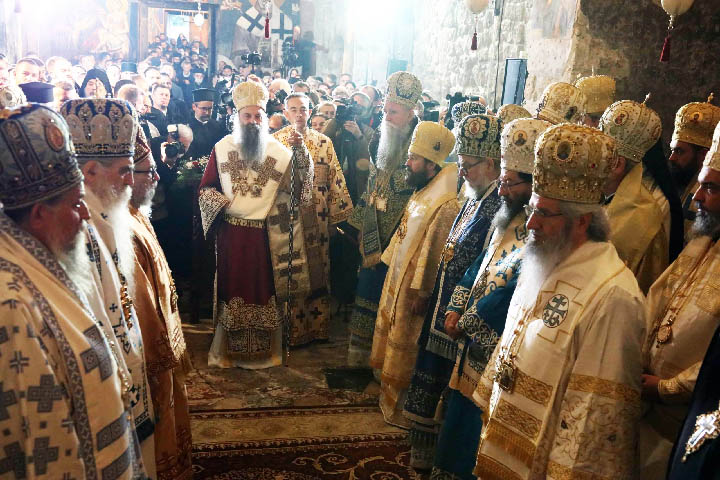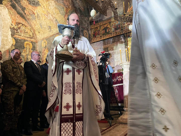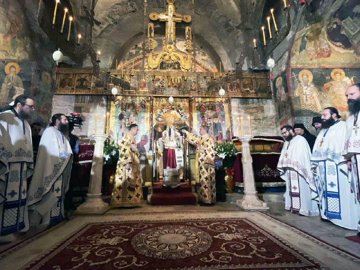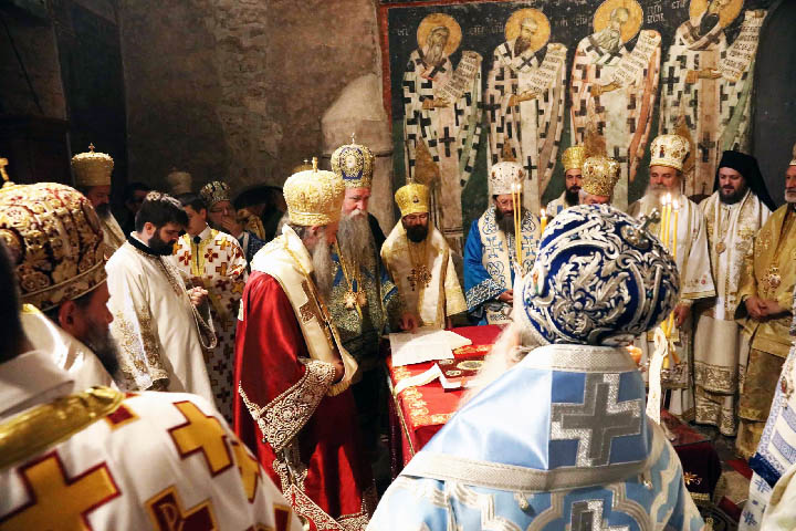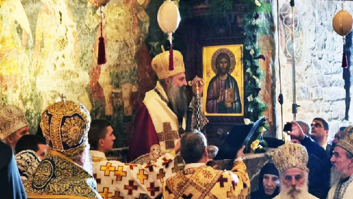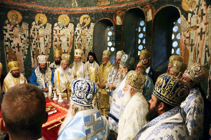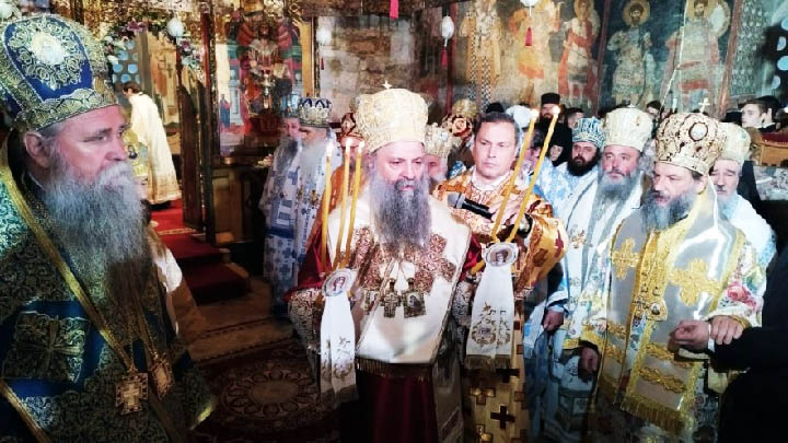 Његова Светост Патријарх српски г. Порфирије началствовао је светом Литургијом у древном манастиру Пећкој Патријаршији уз саслужење Његовог Блаженства Архиепископа охридског и Митрополита скопског Jована; високопреосвећених митрополита дабробосанског Хризостома, црногорско-приморског Jоаникија, будимпештанског и мађарског Илариона из Московске Патријаршије и преспанско-пелагонијског Петра из Македонске Православне Цркве – Охридске Архиепископије; преосвећене господе епископа сремског Василија, будимског Лукијана, бачког Иринеја, жичког Јустина, врањског Пахомија, шумадијског Јована, зворничко-тузланског Фотија, милешевског Атанасија, диселдорфског и немачког Григорија, рашко-призренског Теодосија, западноамеричког Максима, горњокарловачког Герасима, источноамеричког Иринеја, крушевачког Давида, славонског Јована, аустријско-швајцарског Андреја, нишког Арсенија, далматинског Никодима, осечкопољског и барањског Херувима, ваљевског Исихија, шабачког Јеротеја, западноевропског Јустина, стобијског Давида, ремезијанског Стефана, мохачког Дамаскина, марчанског Саве, брегалничког Марка.