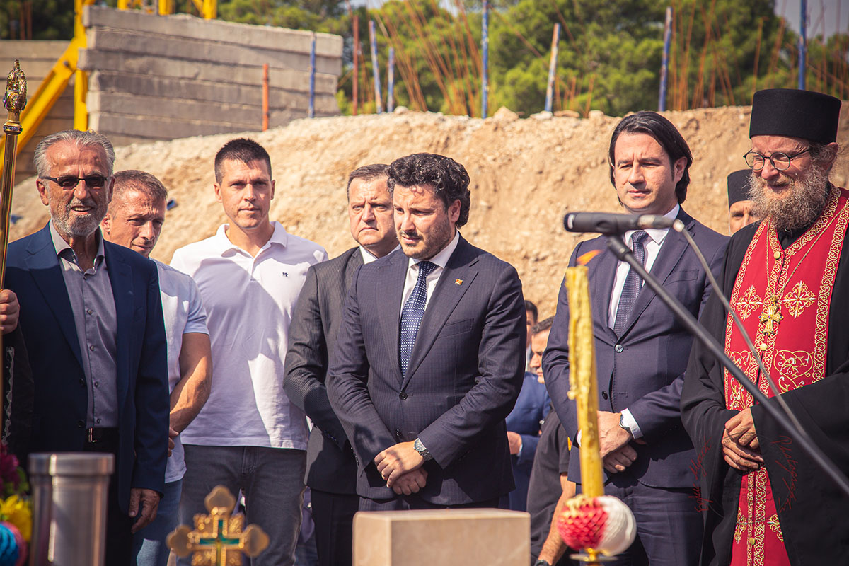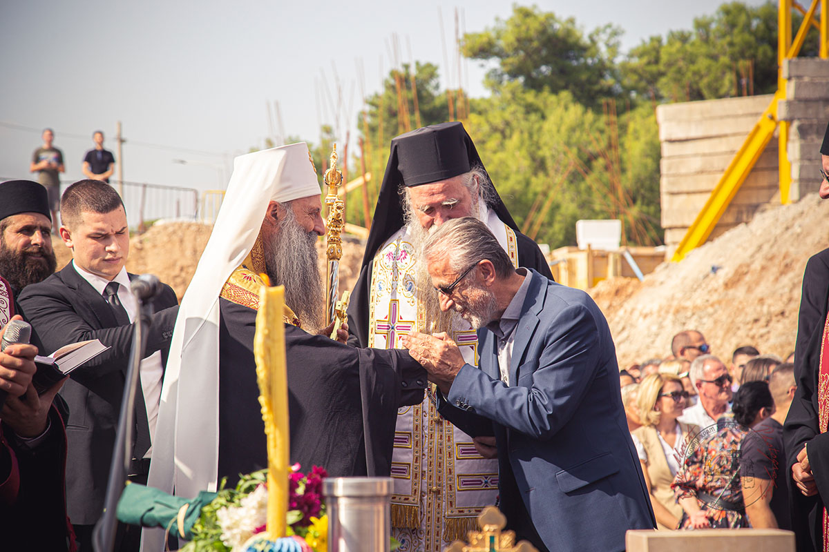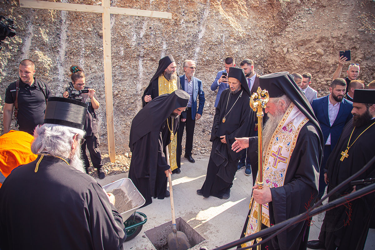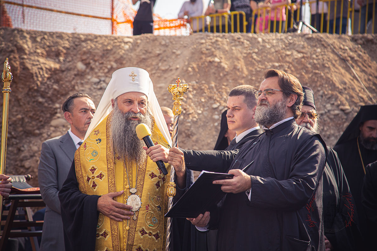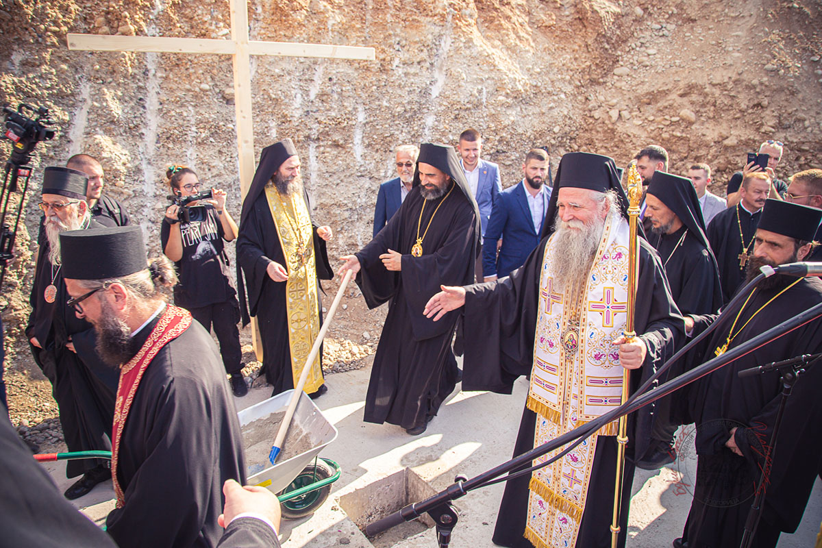 И зато овде у овом храму, посвећеном ником другом до Светом Сави, има места за све. То је храм Српске православне цркве, то је храм Христов – Бога спаситеља свих људи, у којем мора бити места, баш зато што је то светосавски храм, за све људе и за сваког човека. И овај храм мора бити место које чува идентитет, с једне стране, и гради мостове, с друге стране. Отуда је најбољи могући модел продужетка овога храма гимназија која ће се сазидати. Гимназија која је посвећена Светом Сави и која нас подсећа на давну, стару повест коју је, такође, блаженопочивши Митрополит, учећи се, говорио. Подсећа на повест о грчком философу Арстотелу који се пред крај живота вратио у своју постојбину, у постојбину својих очева Стагиру и подигао, управо, Гиманзију – лицеј. И ево, тако се и наш Свети отац Сава вратио и на овај начин, утемељитељ српског, православног и хришћанског идентитета, молитвом и трудом духовног оца вашег, и продужене руке његовог и нашег учитеља духовног оца. Дакле, ваш отац Јоаникије продуженом молитвом и жељом блаженопочившег Митрополита Амфилохија учинио да се врати дому очевом Свети Сава, да се врати у родно место свога оца, светитеља Стефана Немање, Симеона Мироточивог. Да се врати одакле, заправо, није никада ни отишао, ни одлазио и где је увек био. И овај камен темељац, који смо данас освештали, има ту силу, ту снагу, ту симболику. Он је давно, пре више од осам столећа, донет са Свете Горе Атонске. На том светогорском, хиландарском и ватопедском камену темељцу саздана је, на Христовом Јеванђељу, и заснована култура. Саздана је и вековна државност и ове државе Црне Горе, коју волимо и поштујемо, саздана је и просвета и дипломатија и здравство и све чиме се можемо похвалити и дичити у нашем народу. Саздани смо ми као народ. На том светогорском камену изграђено је наше биће. И поред лицеја, дакле, ниче и ова црква Светога Саве. То значи да ће заједно са школским звоном звонити и храмовна звона. И зато и овде одјекиваће стихови Десанке Максимовић, којима ћу и завршити израз радости, љубави ваше и наше према вама и заједничке према Богу: