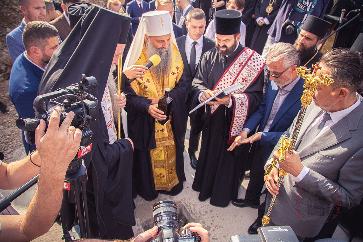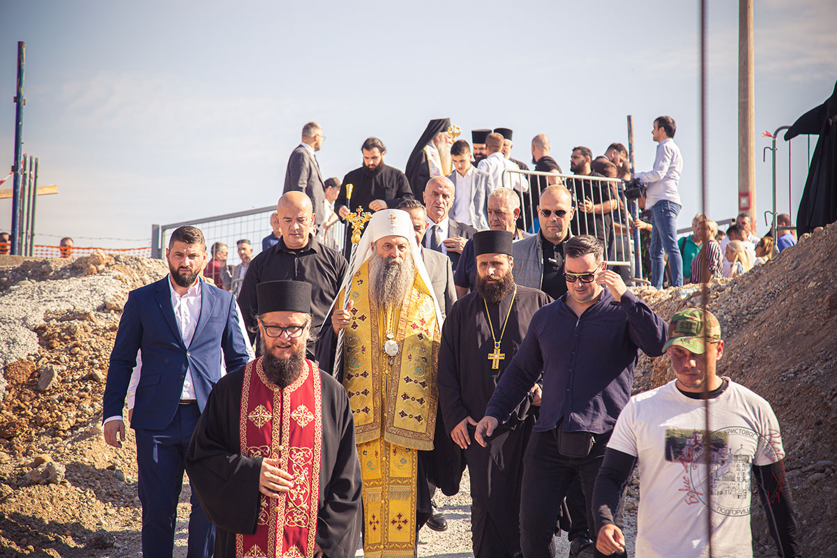 И само када на тај начин храм зидамо и само када такву школу, као што ће бити ова светосавска, имамо, када знамо ко смо, да су нам преци светитељи. То подвлачим – светитељи, дакле они који су се молили Богу и трудили се да ускладе свој живот са Јеванђељем Христовим и заповестима Његовим и који нас гледају са иконостаса. Само тада, браћо и сестре, имаћемо смисао свога постојања, само тада имаћемо заједницу међу собом, разумевање међу собом, љубави међу собом, у породици, у комшилуку, међу рођацима, у свом народу, а и са свим другим народима. И само тада бићемо испуњени увек хвалоспевом и узношењем славе Једноме у Тројици Богу, заједно са Светим оцем Савом, његовм оцем Светим Симеоном Мироточивим, Светим Василијем Острошким, Светим Петром Цетињским у славу Једноме у Тројици Богу, Оцу и Сину и Светоме Духу сада и увек и увекове векова. Амин.”