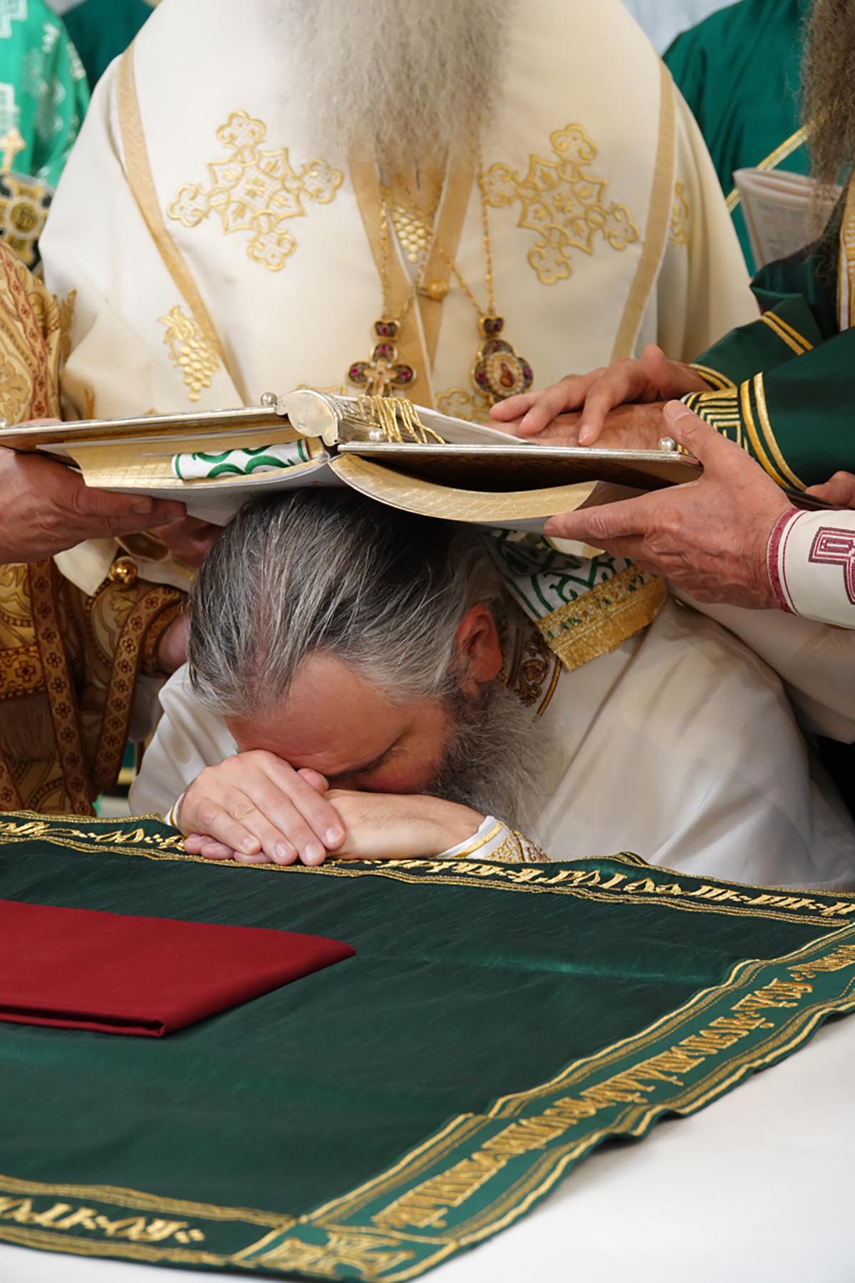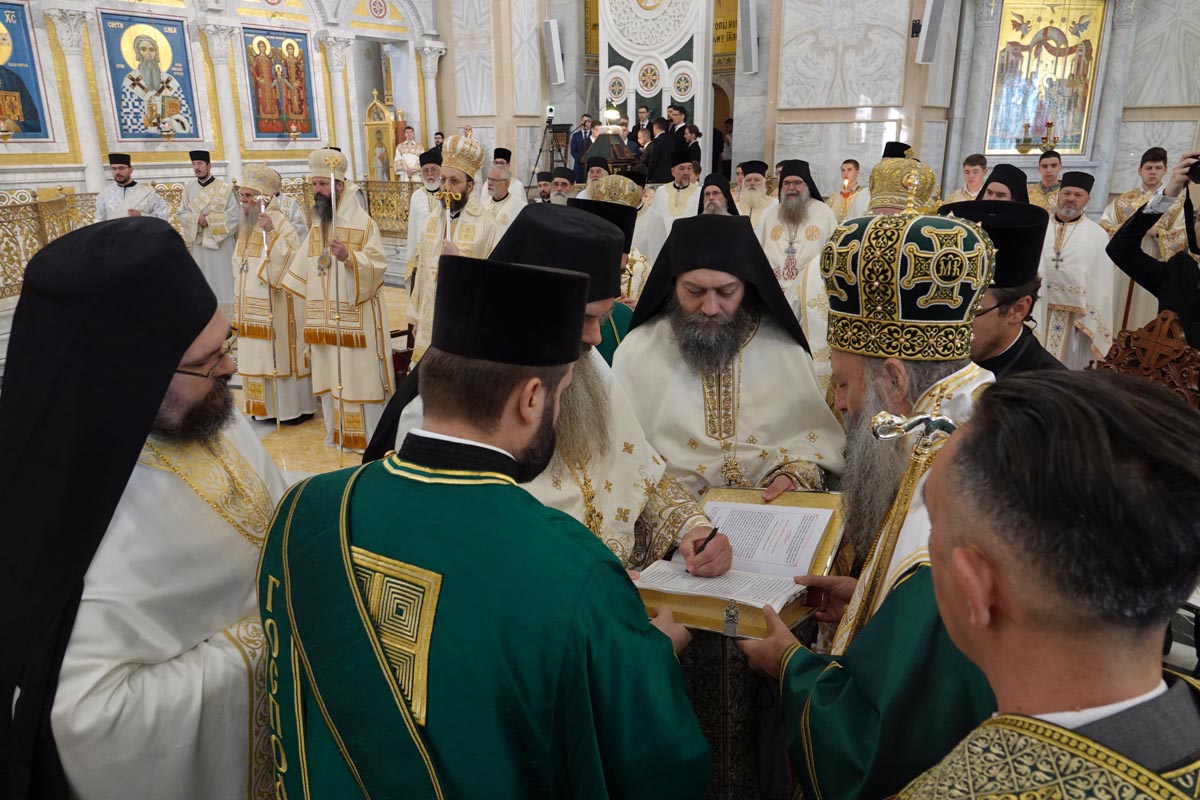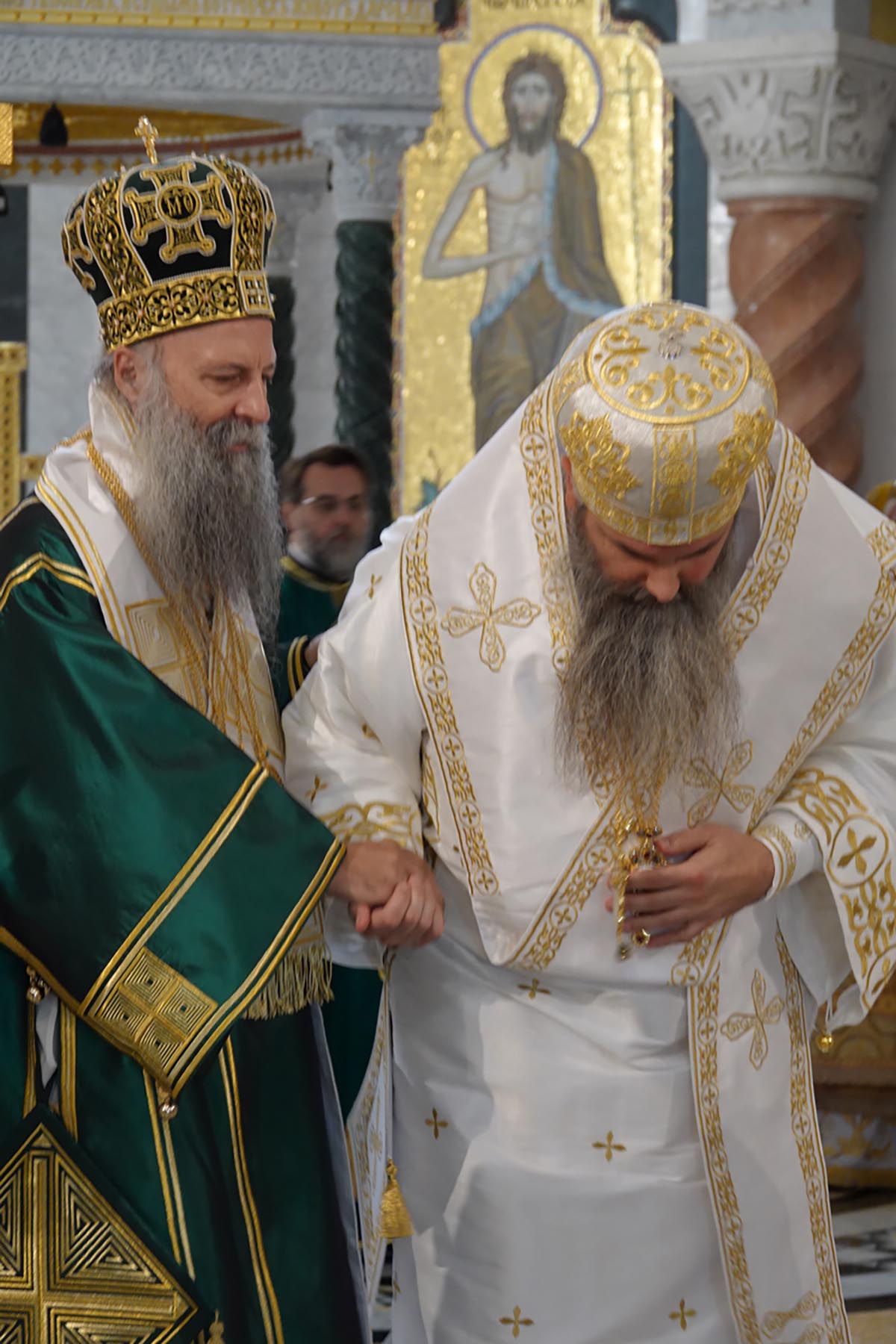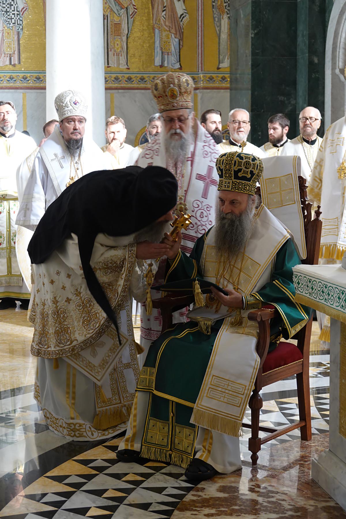 – Епископ је у Цркви постављен да буде на месту и по обличју Христовом, а то значи да врши службу Христову. Пре свега и изнад свега, да врши службу као онај који началствује Евхаристији, да служи свету Литургију која је и пројава и потврда Царства Божјег међу нама, јер у светој Литургији су сви сабрани. Ту је Господ, ту су анђели и небески свет, ту смо и сви ми који ходимо историјом, али ту су, у промислу Божјем, и они који ће тек доћи. Господ је апостолима оставио заповест да служе свету Литургију, и још им је рекао: Идите и проповедајте Јеванђеље, крштавајући све народе у име Оца и Сина и Светога Духа (Мт 28, 19). Дакле, поред свете Литургије, и привођење сваке душе живе тајни познања Исуса Христа као Спаситеља јесте служба епископа. У назначењу Ваше службе открива се и види управо та реч Христова боље него што се то види код неких других епископа, будући да ћете бити у Америци. Тамо ћете не само да чувате и сачувате наш народ, јер Бог је тај који чува и ако Бог не чува узалуд Ви чувате. Тамо се не само због тога да бисте сачували српско име и српски идентитет, то долази тек као последица и као резултат апостолске архијерејске службе, а то је ово што смо навели. Тамо сте да нашем народу сведочите Христа служећи свету Литургију, да крштавате наш народ у име Оца и Сина и Светога Духа. Црква није само један и било који биолошки народ. Црква је народ Божји, Црква је Тело Христово. У Цркву су позвани сви народи. Отуда, служећи најпре нашем народу, позвани сте да сведочите Христа и свим људима независно од тога ком народу припадају и које су боје коже, да сведочите Христа свим људима и свим народима и да све приводите Цркви, да све крштавате у име Оца и Сина и Светога Духа. Са тим жељама и благословом у име Сабора, ми Вам поверавамо овај жезал речима: Прими жезал овај да напасаш поверено ти стадо Христово! Послушнима нека буде за ослонац и укрепљење, а непослушне и непокорне упућуј и карањем и кротким васпитавањем, у Христу Исусу Господу нашем. Достојан!