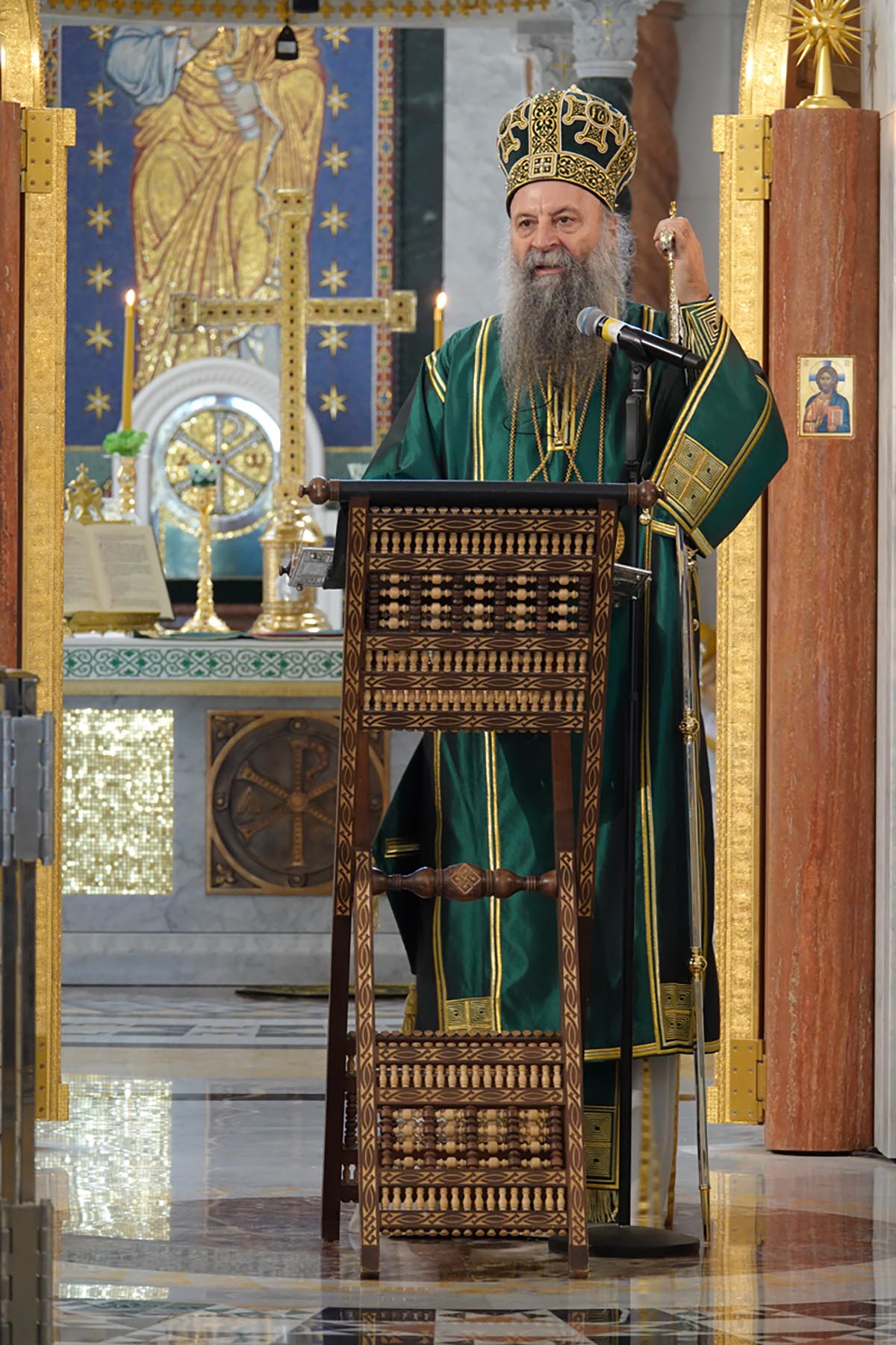 Објашњавајучи прочитану јеванђељску причу о талантима, патријарх Порфирије је истакао значај препознавања и умножавања дарова које нам је Бог даровао и подсетио да ништа од онога што поседујемо није наше, већ да је све од Бога и да нам је дато као залог да га умножимо и дарујемо ближњима: