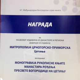 Одлуком жирија 67. Међународног београдског сајма књига награда Најбољи издавач из дијаспоре и региона 2024. припала је Митрополији црногорско-приморској за монографију Рукописне књиге манастира Рођења Пресвете Богородице на Цетињу, аутора Милене Мартиновић. Награду у име издавача је примио протојереј Александар Лекић.