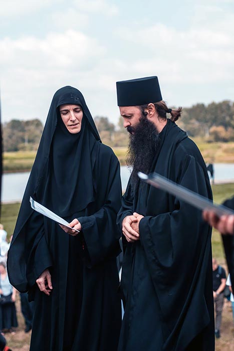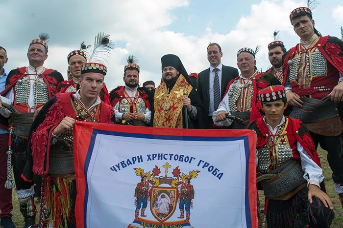 Том приликом пригодном беседом окупљени народ поздравио је најпре Преосвештени владика г. Јоаникије, а затим и Његово Преосвештенство Епископ Марински г. Инокентије, заблагодаривши при томе Преосвештеном владици г. Јовану на указаној части и љубави за ову молитвену радост и окупљање у спомен Светих Новомученика Јасеновачких. На крају свог обраћања, у спомен на овај велики и занчајно догађај за цело Православље, Епископ Инокентије подарио је владици Јовану архијерејске инсигније – крст и панагију.
