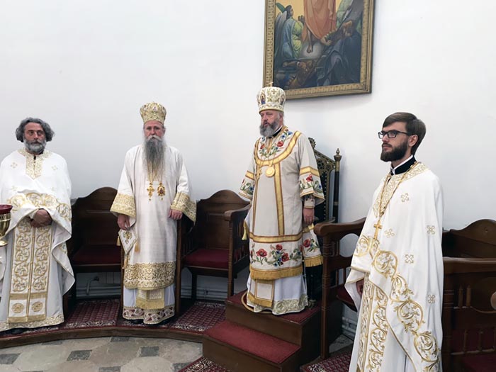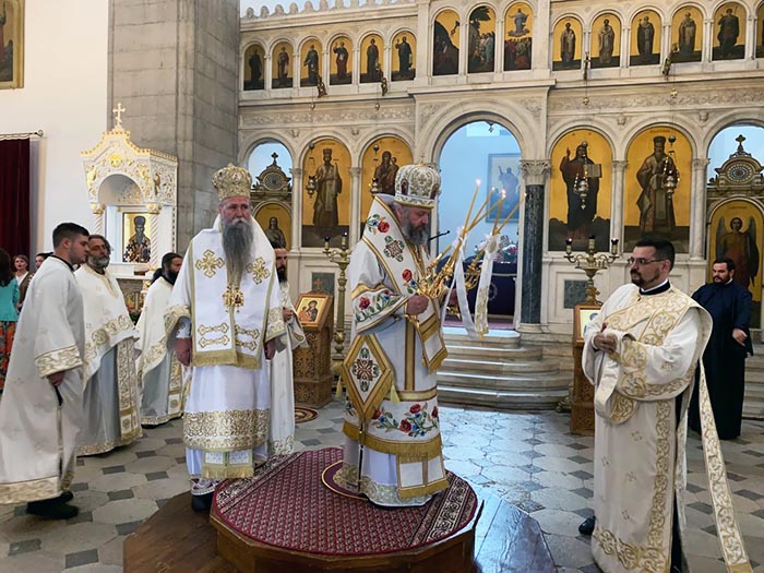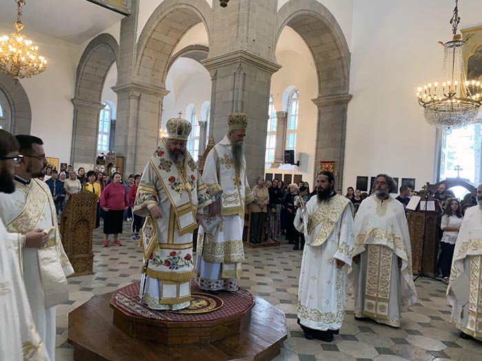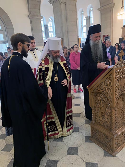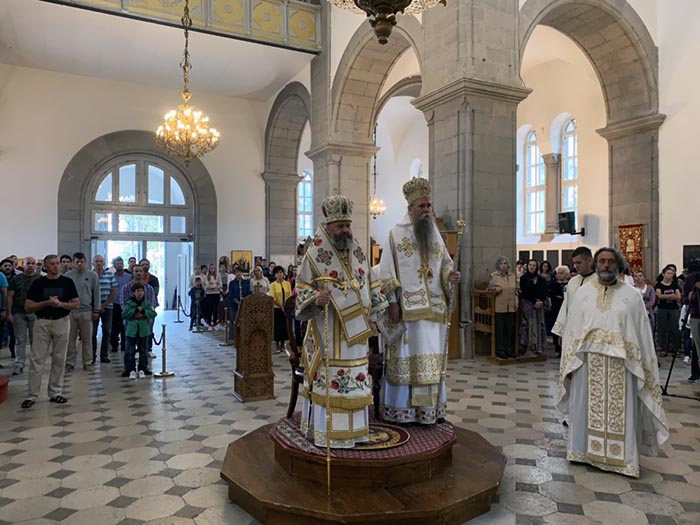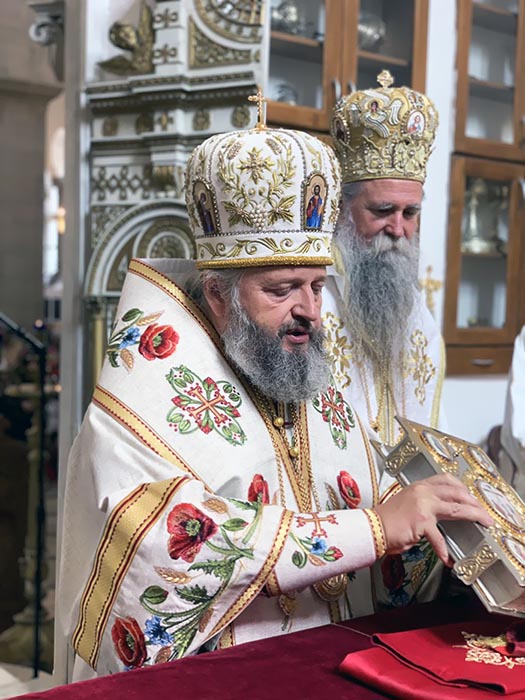 Његово Високопреосвештенство Митрополит кемеровски и прокопијевски РПЦ Г. Аристарх и Његово Преосвештенство Еписикоп будимљанско-никшићки Г. Јоаникије служили су, у 12. недјељу по Педесетници, 8. септембра 2019, Свету Архијерејску Литургију, у Саборном храму Светог Василија Острошког у Никшићу.
