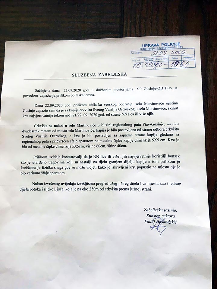 24.09.2020. Вијести У селу Мартиновићи код Плава поново је скинут крст са капије црквишта која је претходно била украдена. Службеници полиције ОБ Плав су изашли на лице мјеста и сачинили службену забиљешку о томе.