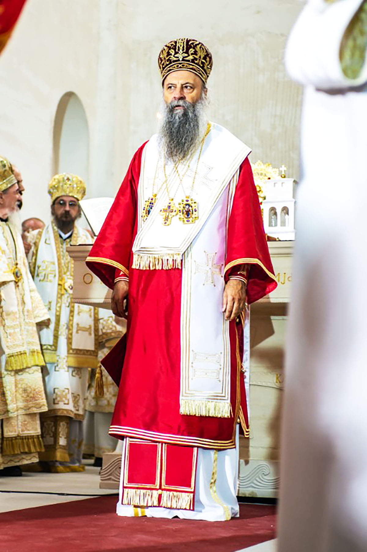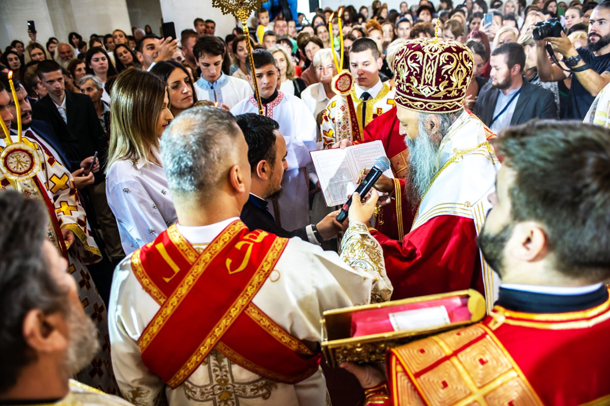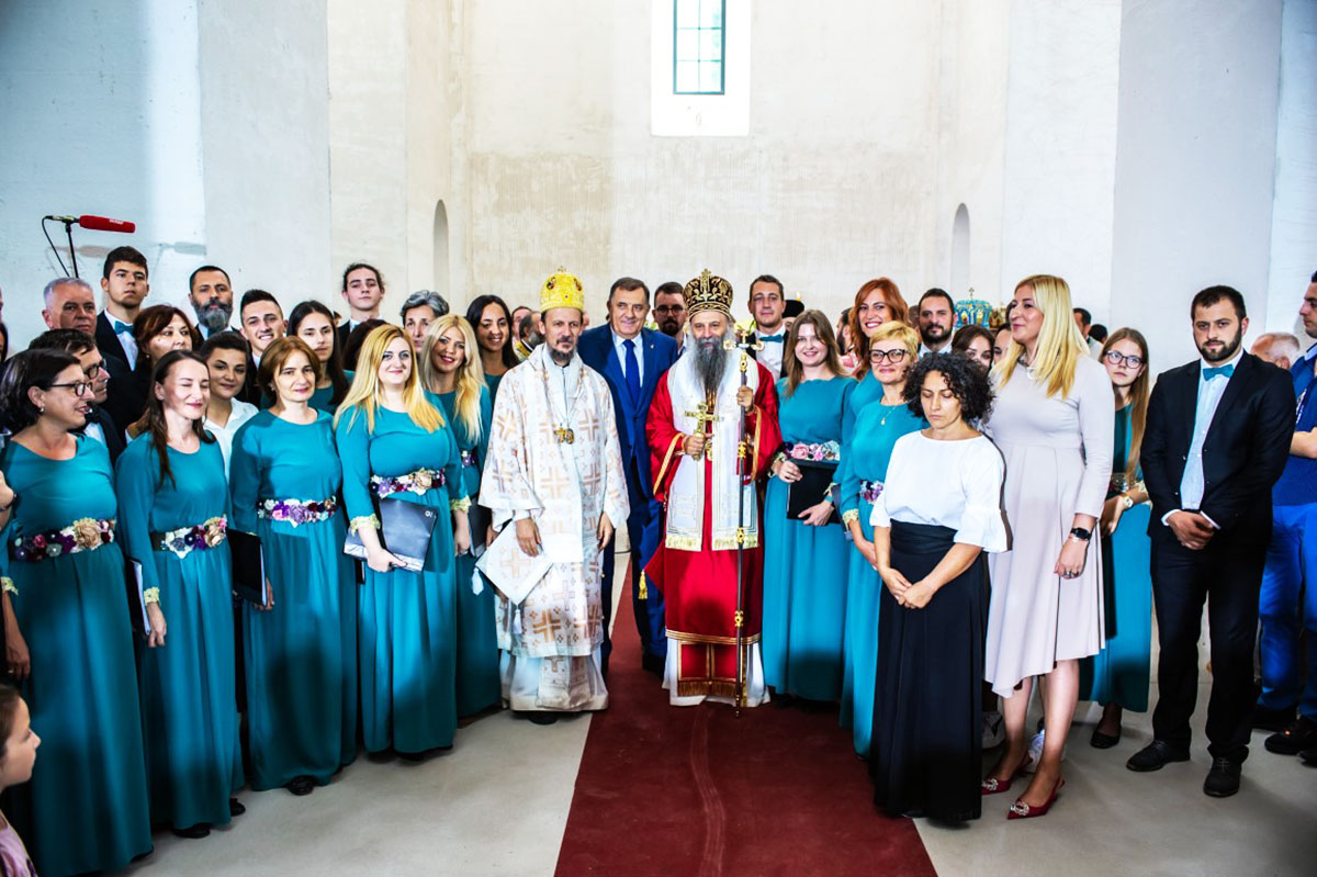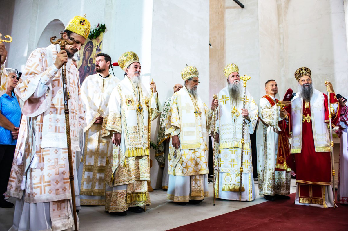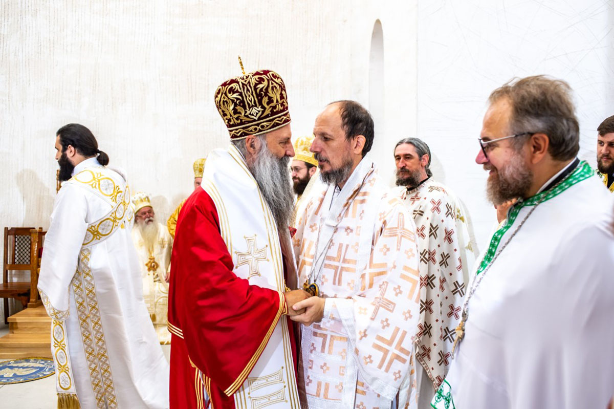 Његовој Светости Епископу пећком, Митрополиту београдско-карловачком и Патријарху српском господину Порфирију саслуживали су преосвећена господа Архијереји Митрополит дабробосански Хризостом, Митрополит црногорско-приморски Јоаникије, Епископ британско-скандинавски Доситеј, Епископ врањски Пахомије, Епископ шумадијски Јован, Епископ милешевски Атанасије, Епископ диселдорфско-њемачки Григорије, Епископ горњокарловачки Герасим, Епископ славонски Јован, Епископ бихаћко-петровачки Сергије, Епископ буеносаирески Кирило, Епископ будимљанско-никшићки Методије и Епископ јегарски Нектарије, викар Патријарха српског и домаћин Епископ захумско-херцеговачки и приморски Димитрије. Преосвећеној господи архијерејима саслуживало је бројно свештенство и свештеномонаштво Епархије захумско – херцеговачке и приморске и других епархија СПЦ.