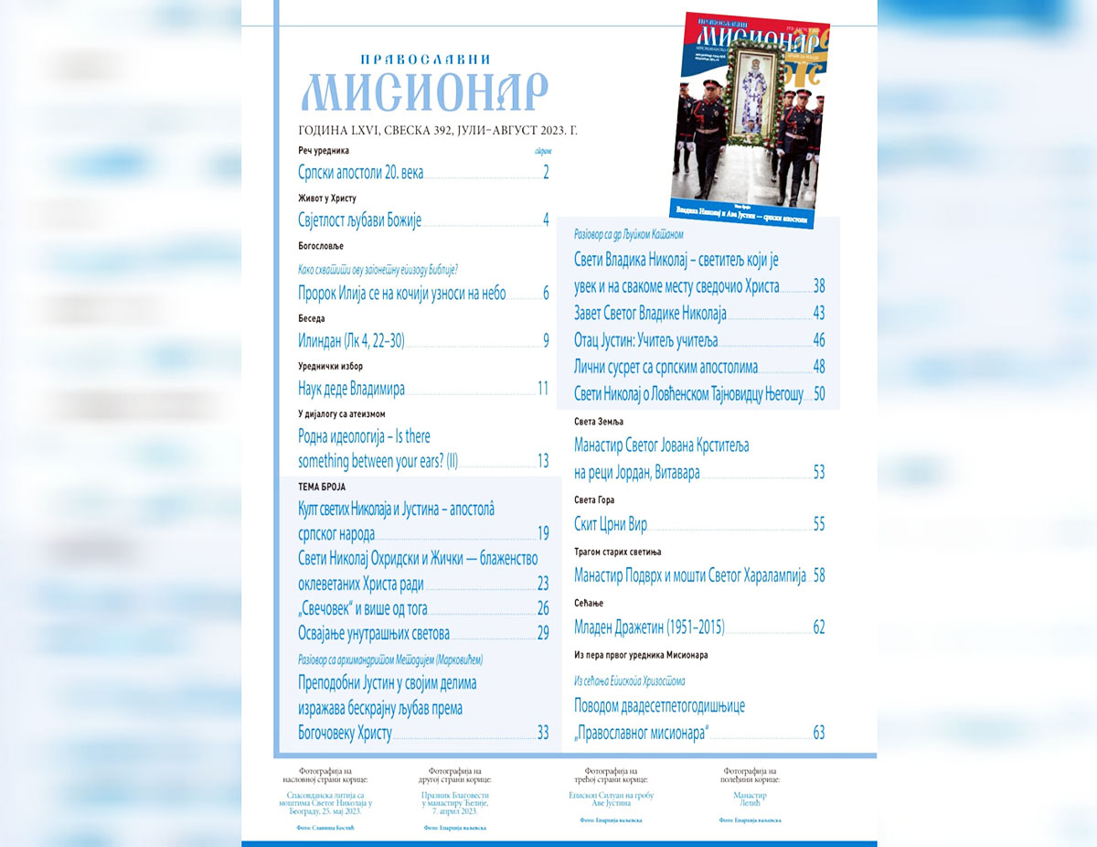 У данима када смо богослужбено прославили начало Индикта и почетак Црквене нове године, узносећи молитве за благословено ново лето доброте Господње, пред читалачком публиком се нашао нови 392. број „Православног мисионараˮ, званичног мисионарског гласила Српске Православне Цркве за младе. Тема четвртог по реду броја у 2023. години носи наслов: „Владика Николај и Ава Јустин - српски апостолиˮ.