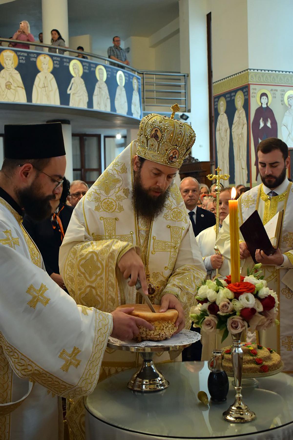 Након заамвоне молитве, Преосвећени Владика стобијски Јаков осветио је славске дарове и пререзао славски колач, припремљен поводом храмовне и градске славе.