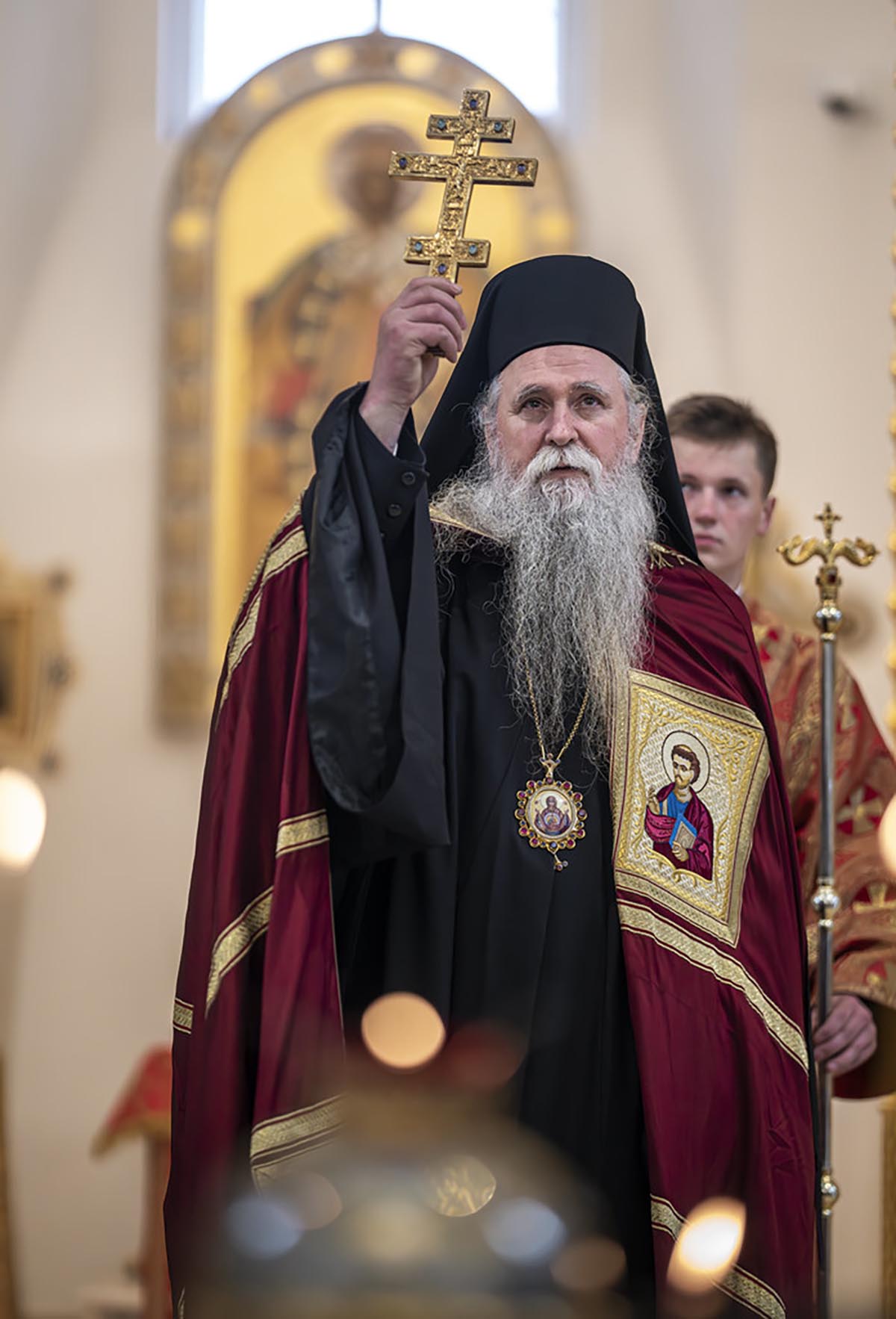 Митрополит Јоаникије, обучен у архијерејску мандију, прислужио је свијеће пред кивот са дјелом моштију Светог благоверног кнеза Михаила Тверског, као и иконама Васкрсења Христовог и Преображења Господењег..