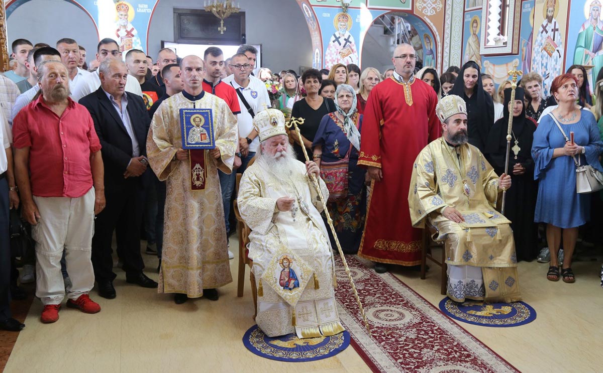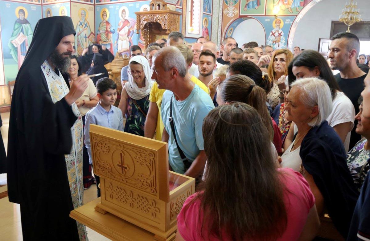 Након освештања храма у храм је унешена честица часних моштију Светог оца нашег Варнаве, коју је Високопреосвећени митрополит Хризостом донио из Сремских Карловаца а које му је предао Епископ сремски Господин Василије. Честицу моштију Светог оца Варнаве до новоосвећеног храма донио је Високопреподобни протосинђел Серафим Глигић, настојатељ манастира Тилаве у ком је за кратко боравила. Испред самог храма мошти је од оца Серафима преузео Митрополит Хризостом и унио их у свети храм и изложио их на поклоњење многобројног народа. Први су свете мошти цјеливали митрополит Хризостом и епископ Методије, а потом свештенство и вјерни народ.