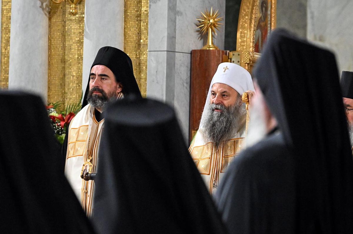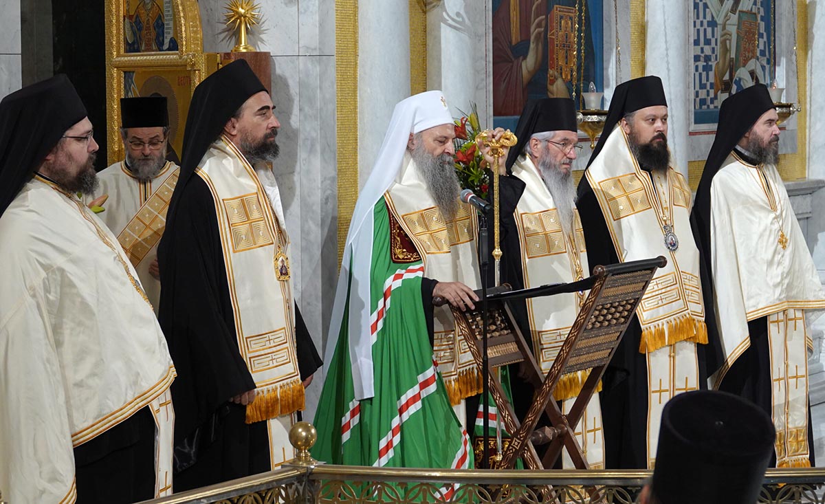 – У име Оца и Сина и Светога Духа! Браћо и сестре, сабрали смо се у љубави Божјој у овом првом и најважнијем дому српског народа, у саборном и заветном храму посвећеном Светитељу Сави, духовном родоначелнику нашег рода, да се помолимо Богу за саборност и духовно јединство нашег народа, као и за мир међу свим људима и свим народима.