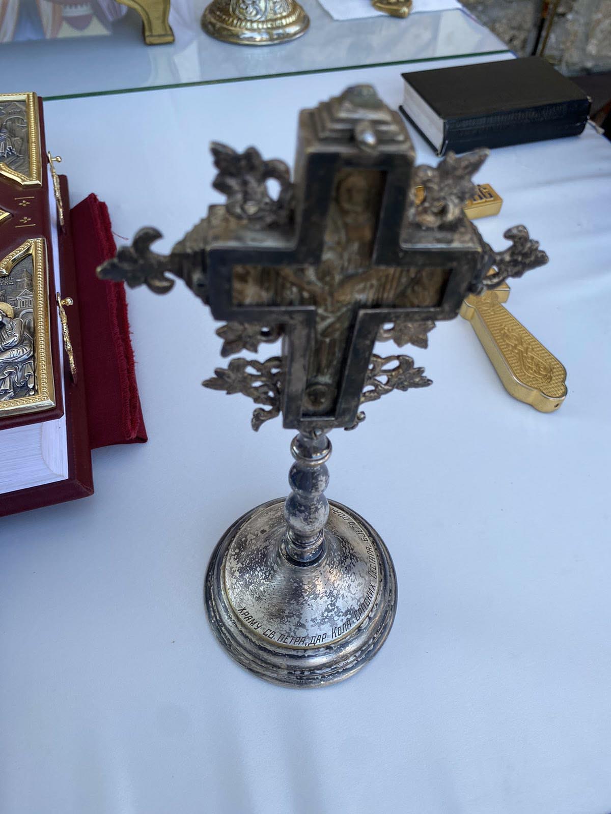 „Имамо још једну радост данас, крст који је био украден `80. их година, из ове велике светиње, а који су, прије сто и више година, Коло српских сестара даровале овом светом храму пронађен је и милошћу и добротом Дејана Спајића из Бања Луке који се бави колекционарством и антиквитетима, пронашао је и дошао до тог крста, откупио га и послао данас овдје, и служили смо, ту је на Часном престолу. Вратио се Часни крст цркви Светог апостола Петра, пише на њему угравирано: Храму Светог Петра, дар Кола српских сестара, Бијело Поље. По томе се знало гдје припада и, ево, данас на славу храма Свети апостоли Петар и Павле су га донијели рукама Дејана Спајића, којег је Господ просвијетлио да се осјети да треба да се врати тамо гдје је крст и припадао. Не само овом храму, него читавом народу да се с њим народ благосиља, кроз њега благодат Христова да милује и благосиља народ православни овдје и шире“, поручио је Преосвећени Епископ Методије, честитајући празник Светих Петра и Павла и храмовну славу.