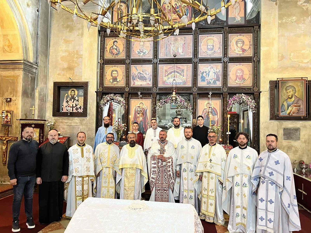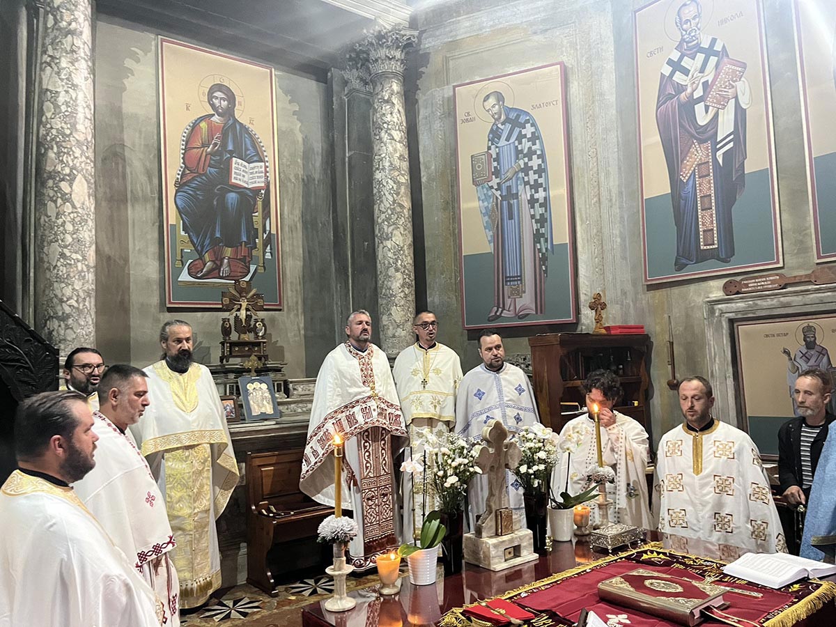Светом литургијом је началалствовао протојереј-ставрофор Синиша Сердар, парох у Мркоњић Граду. Саслуживали су му протојереј-ставрофор Синиша Јанковић, старешина храма Светог Симеона Мироточивог у Беранама, протојереј Далибор Ђукић, парох у Вићенци, и архијерејски намјесник за Италију из Епархије аустријско-швајцарске, протојереј мр Раде Јовић, парох у Земун Пољу и старешина храма Светог цара Лазара из Архиепископије београдско-карловачке, протојереј др Никола Гаврић, старешина цркве Светог Луке на Кошутњаку из Архиепископије београдско-карловачке, протојереј Ненад Калем, парох которски из Митрополије црногорско-приморске, протојереј Никола Темеринац, парох у Жабљу из епархије бачке, протојереј Ненад Лазић, парох тењски из епархије осјечко-пољске и баарњске јереј Александар Миликић из епархије жичке, јереј Милан Крстић, парох дворански из Епархије крушевачке и јереј мр Блажо Р. Божовић парох подгорички из Митрополије црногорско-приморске.