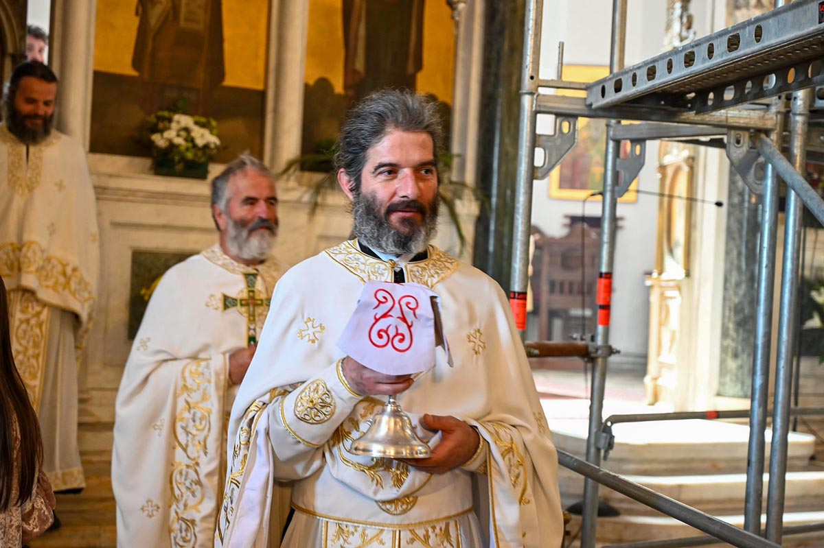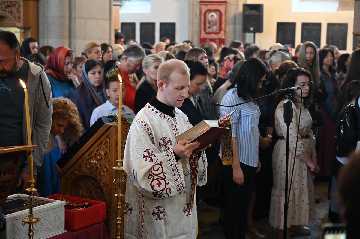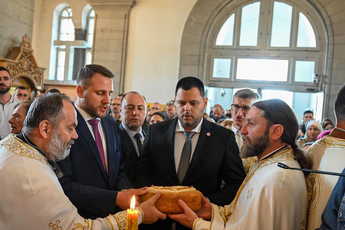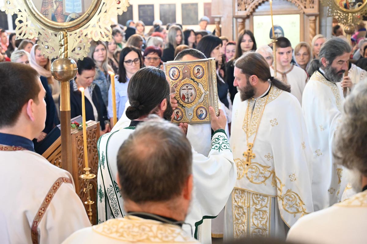 „Да нам Господ Бог да да нас та заједница опомене и покаже све наше слабости, да се исмије сваком нашем властољубљу, да се исмије свакој нашој страсти, али и да их зацијели, да нам та заједница да снаге да пренесемо све оно што нас одваја од Бога, да пренесемо крст који носимо, да са нама умножи наше радости и да растерети наше туге. Зато је за све нас који смо рођени у овом храму и за све нас који замишљамо небески Јерусалим баш са оваквим храмом, који има баш овакав звоник и баш овакву куполу, који никада није живописан бојом, али је увијек живописан живим и истинитим људима, зато је за нас овај дан битан јер онда знамо тачно ко смо и колико смо се удаљили од себе, али и знамо гдје то треба да се вратимо“, бесједио је јереј Тадија Никчевић, поручивши да је дивно бити дио ове заједнице, дио дарова који се изобилно изливају на вјерни народ у овај дан, на овом светом престолу.